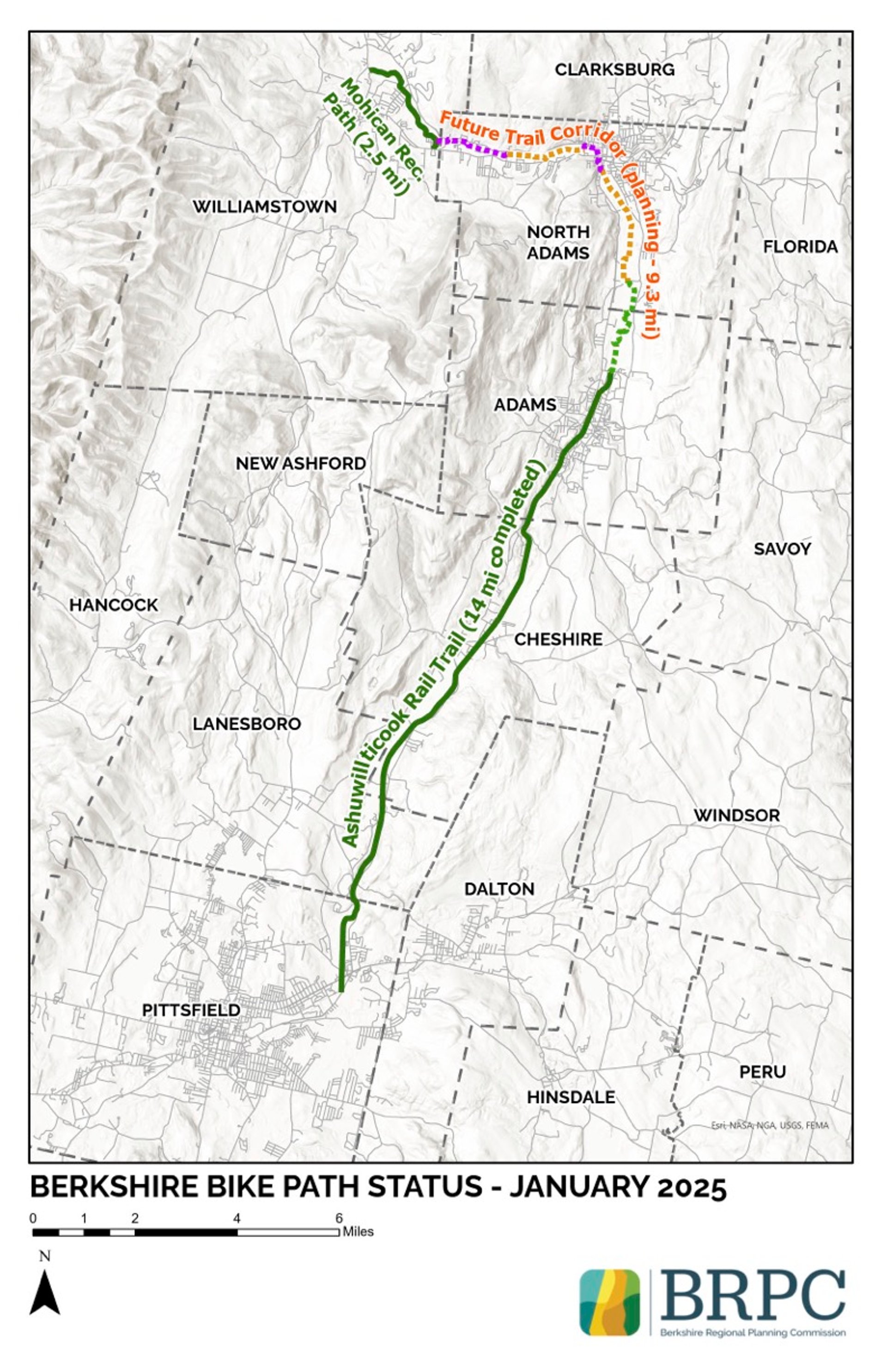 In 2024, more than 122,000 bicycle and pedestrian trips were recorded entering the Ashuwillticook Rail Trail at Route 8 in Lanesborough and Park Street in Adams, Massachusetts, according to BRPC. Bringing the new trail to life requires “regional thinking” and cooperation between municipalities, private businesses and non-profits, Brennan says. “We are celebrating that this is so collaborative.”