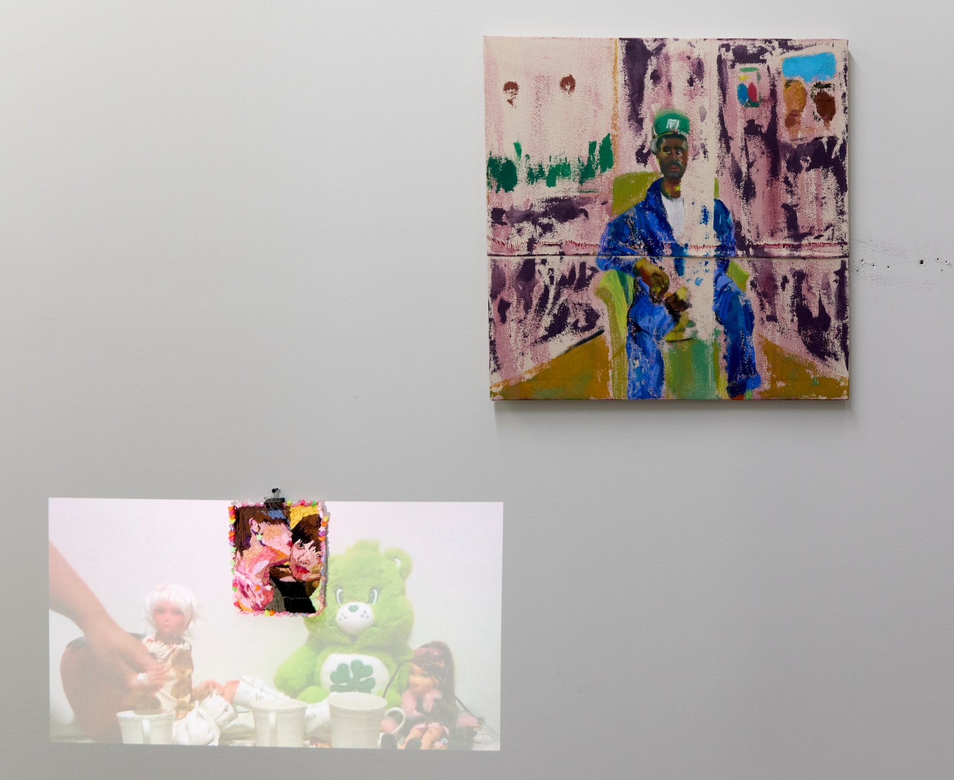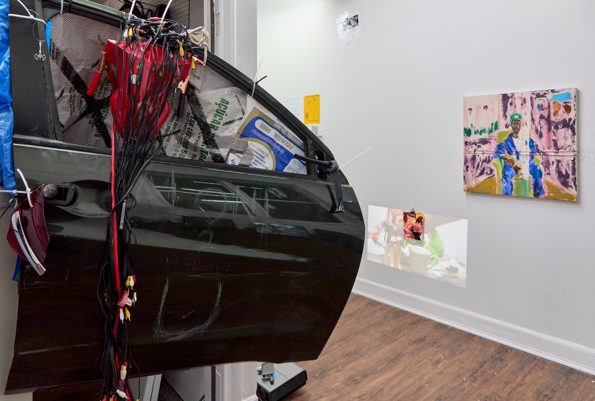 Installation view of Pay What You Want at Haul Gallery including, at right, Zakariya Abdul-Qadir’s Bound by threaded dreams (2025) Courtesy Haul Gallery, Brooklyn, New York