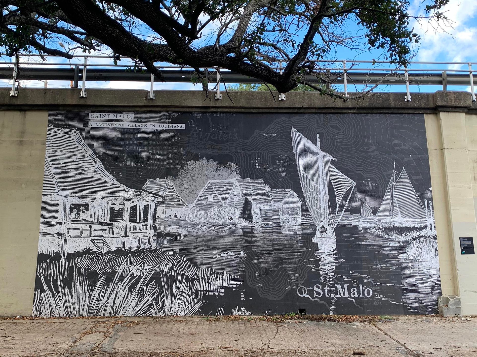 Stephanie Syjuco's mural Phantom Visions (The Lacustrine Village of St. Malo)