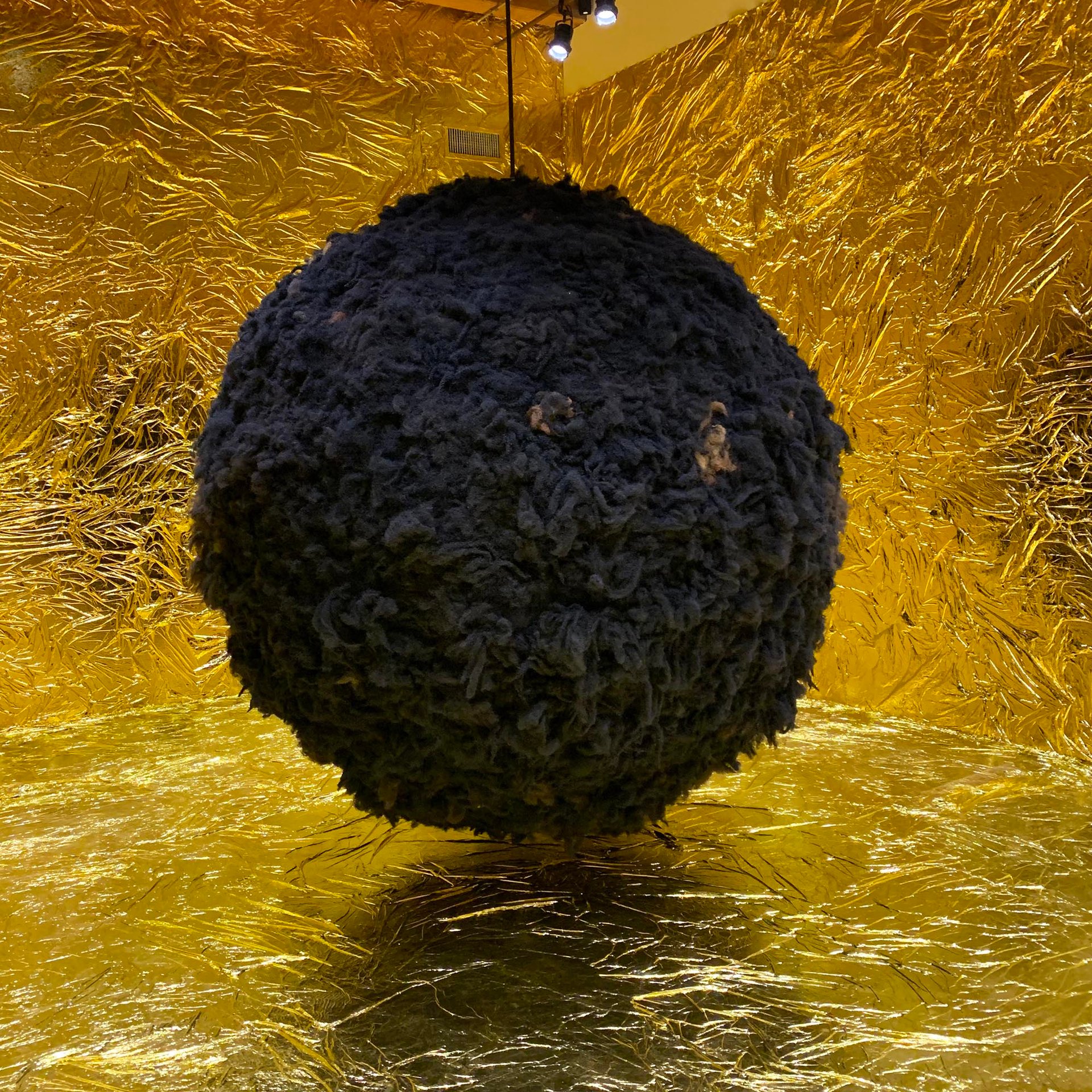 A replica of the famous Star Wars vessel the Millennium Falcon, esparza’s Mexica Falcon after Dewey Tafoya (2024) has been fashioned from adobe made of locally sourced Mississippi clay and stamped with ancient Aztec iconography. It is flanked by Tafoya’s towering scrolls of amate, a bark-based paper that has been in production in Mexico for millennia (and was banned by Spanish colonisers), printed with related imagery referencing pre-colonial agriculture and Chicano identity. Azim’s kinetic sculpture nearby features two jump ropes attached to electric motors, perpetually swinging in a double-dutch configuration. The work alludes to both the Millennium Falcon’s ability to make the “jump” into hyperspace, travelling across space and time, as well the ancient Phoenician and Egyptian origins of jumping rope. The Afrofuturist installation reminds visitors that much of the knowledge necessary to transcend our current cultural, environmental and political crises is readily available and often ancient in origin.