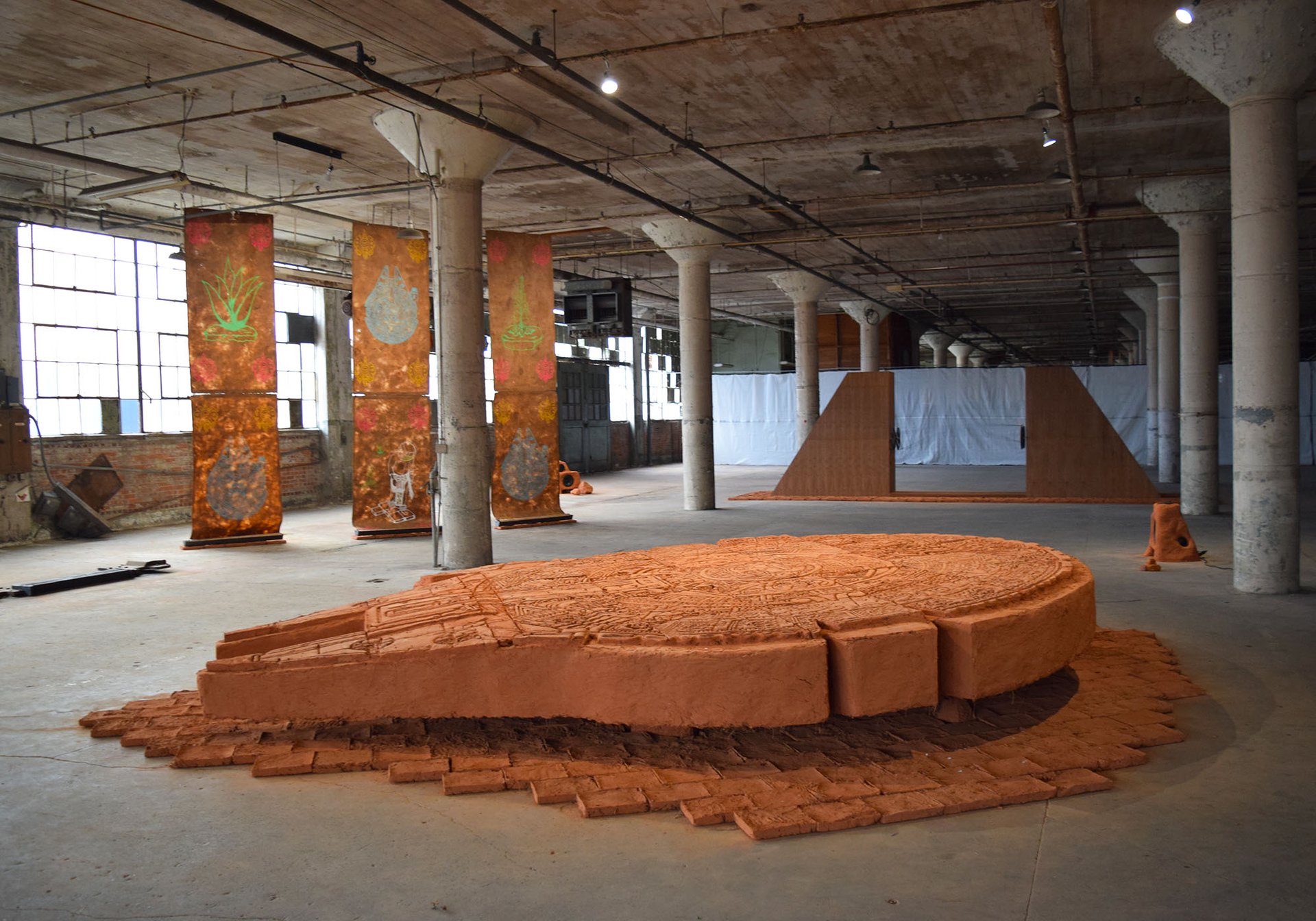 Works by Zalika Azim (back right), rafa esparza (foreground) and Dewey Tafoya (back left) in Proposals for Loops in Linear Time at the Ford Motor Plant Benjamin Sutton