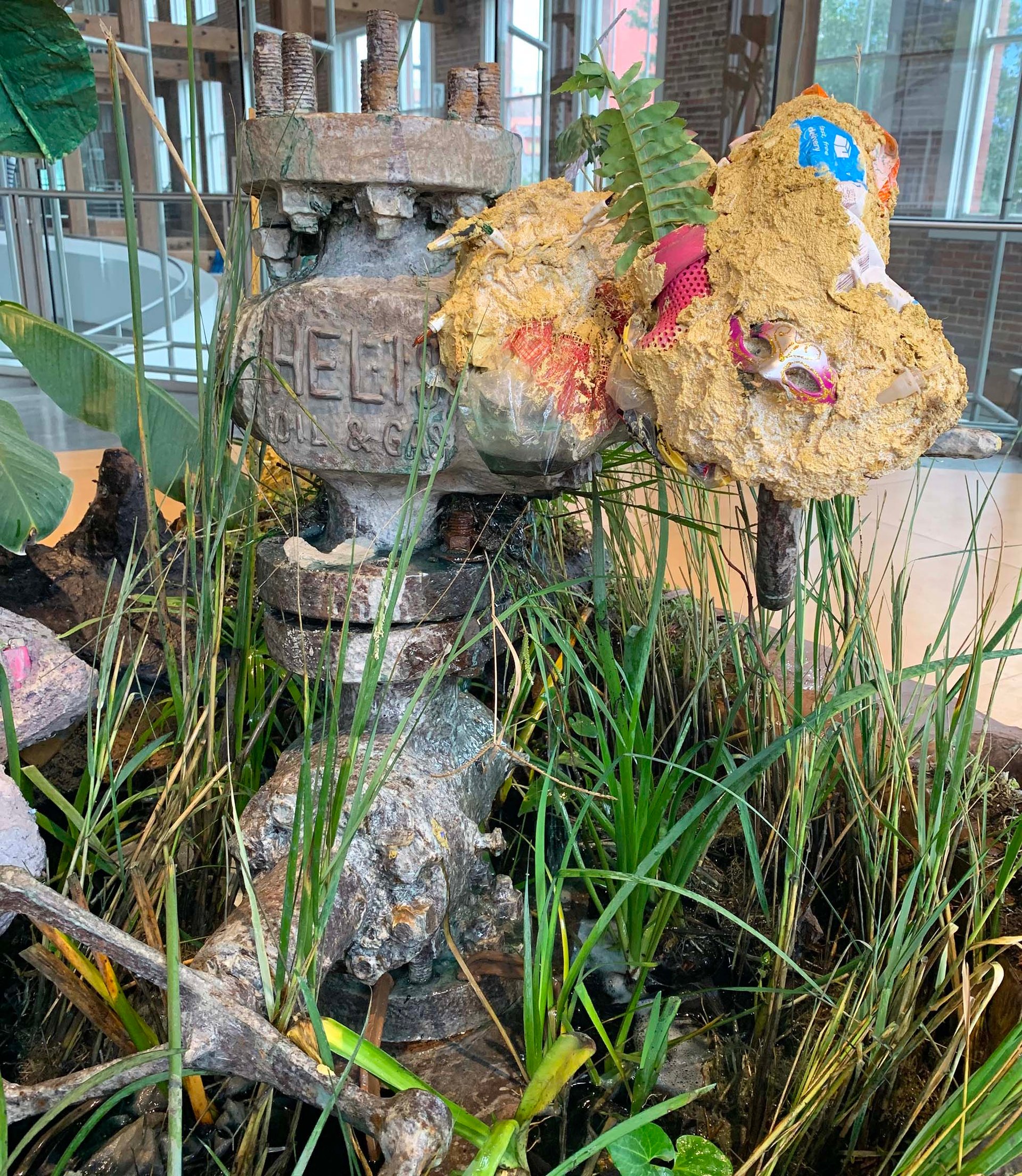 The Baltimore-born, New Orleans-based artist Hannah Chalew has transformed one of the often forgotten features of Louisiana’s landscape, oil and gas infrastructure, into the basis for an indoor fountain. Her installation Orphan Well Gamma Garden (2024) is fashioned from a material she calls “plasticane”—a mix of shredded plastic waste and bagasse, the byproduct of processing sugarcane into juice—and also includes a salvaged oil wellhead, plants native to southern Louisiana and the artist’s custom scent, dubbed Fertile Rot, which is based on the odour of the gasses generated by swamps.