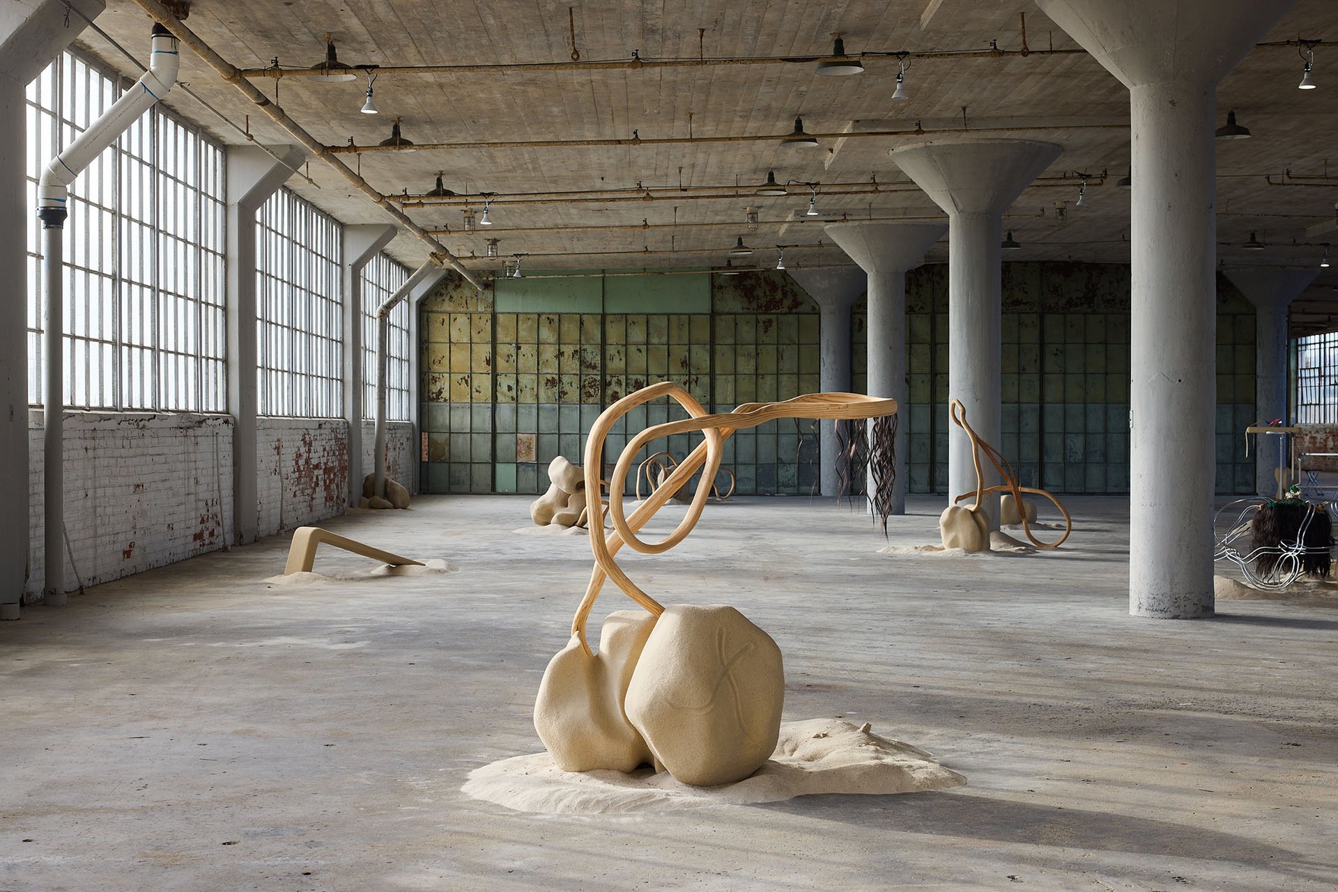 On the Ford Motor Plant’s upper level, the Lima-born, New Orleans-based artist Blas Isasi's installation 1,001,532 CE (2023-24) imagines a futuristic, post-human version of the Peruvian landscape. It projects an event from 1532—the bloody Cajamarca Massacre, which occurred shortly after the first contact between the Spanish and the Inca, and ultimately led to the collapse of Peru’s pre-Columbian civilisation—one million years into the future. Isasi’s group of sculptures melds elements of Peru’s environments (the sand of its coast, the rocks and minerals of the Andes and the wood of the Amazon) into abstracted, otherworldly forms that evoke wind-carved rock, driftwood and desert plants. Some also feature hair extensions, clay, foam and other materials that bring them to life, suggesting future beings formed from raw materials.
