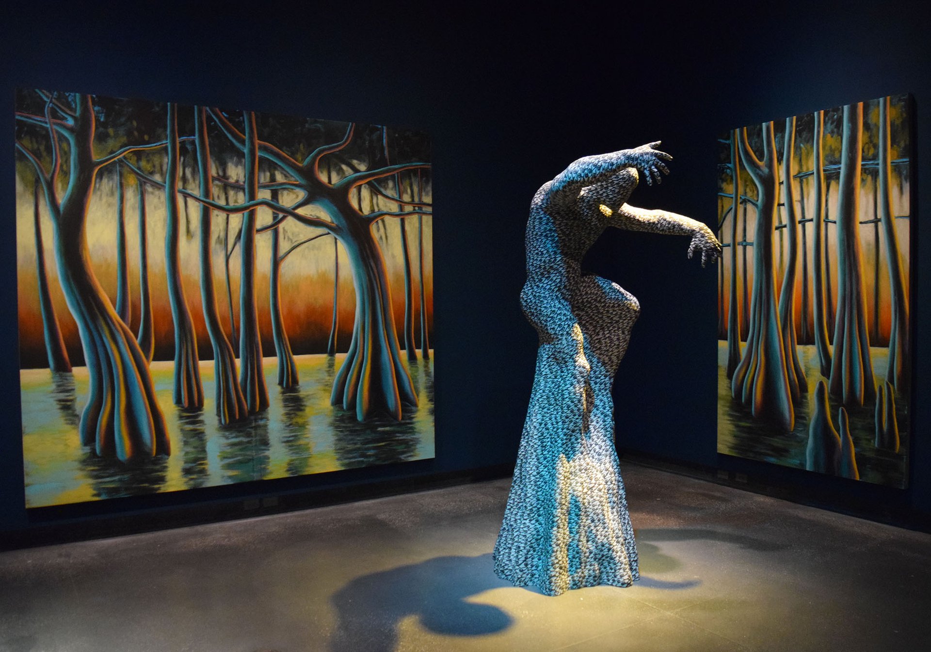 A similar kind of elemental awakening plays out at the Historic New Orleans Collection in the French Quarter, where the Haiti-born, Philadelphia-based artist Didier William has created an installation of new paintings and sculptures titled Gesture to Home. The works are inspired by the cypress trees of the Atchafalaya Basin, the largest swamp and wetland in the US, located to the west of New Orleans. Unlike William’s best-known works, the paintings here are devoid of humanoid figures, and the region’s distinctive bald cypresses take the starring role. In the adjacent sculptures, covered in the artist’s trademark eye patterns, the cypresses’ trunks sprout human figures.