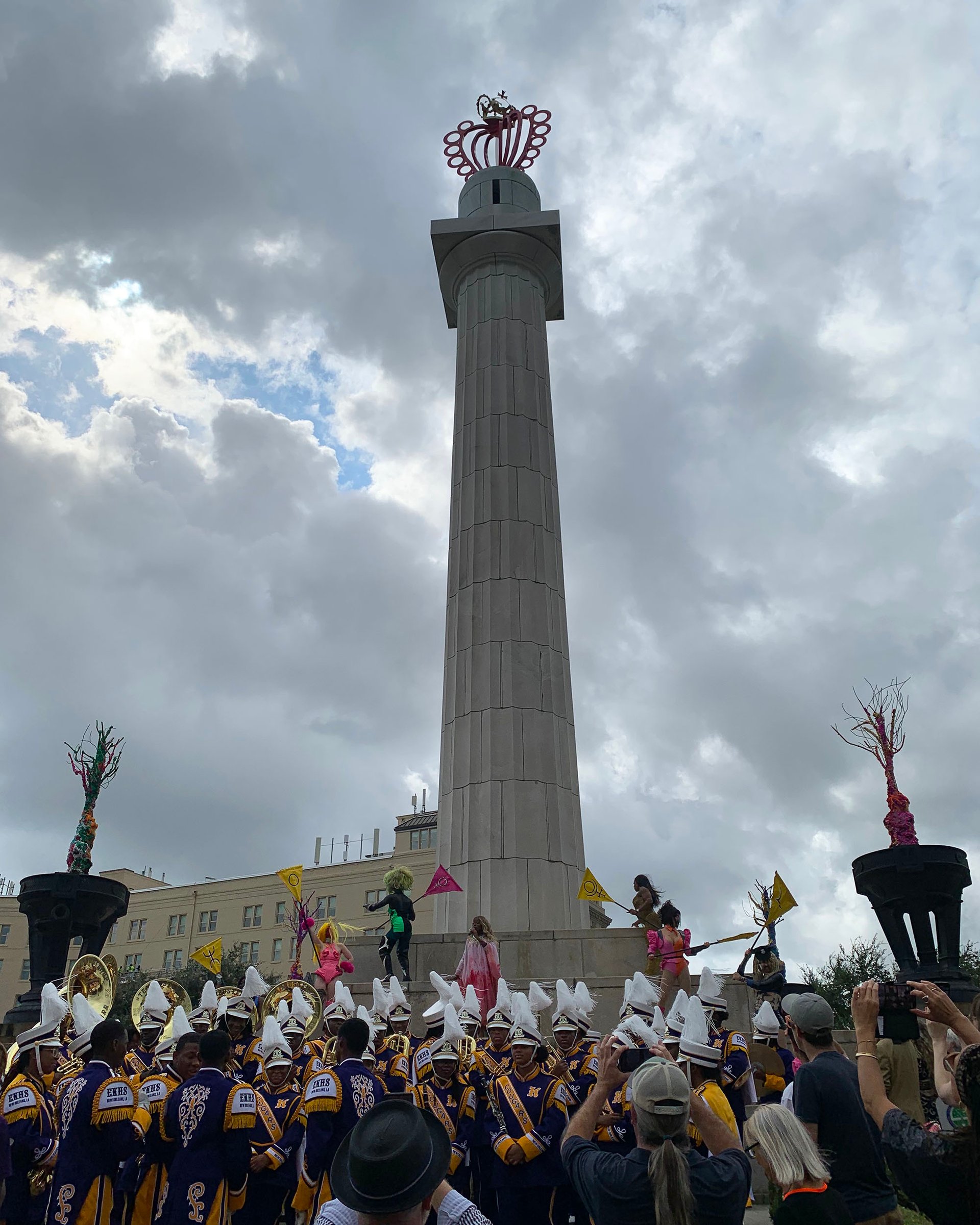 Other Prospect artists use historical context as a point of departure for projecting stories of belonging and resilience into the near and distant future. Perhaps most literally, the Mexico-born, New York-based artist Raúl de Nieves has transformed the vacant pedestals of a former Confederate monument into a tribute to New Orleans’s queer and Latinx communities. A crowned heart atop the monument’s marble column references Mexican folklore and Catholic iconography, while four surrounding pedestals hold trees fashioned from Mardi Gras beads provided by the city’s first all-women Mardi Gras krewe. A Prospect kick-off event included performances at the monument by the Edna Karr High School marching band and members of the Choke Hole queer wrestling troupe, symbolically reclaiming a site long associated with white supremacy for queer communities and communities of colour.