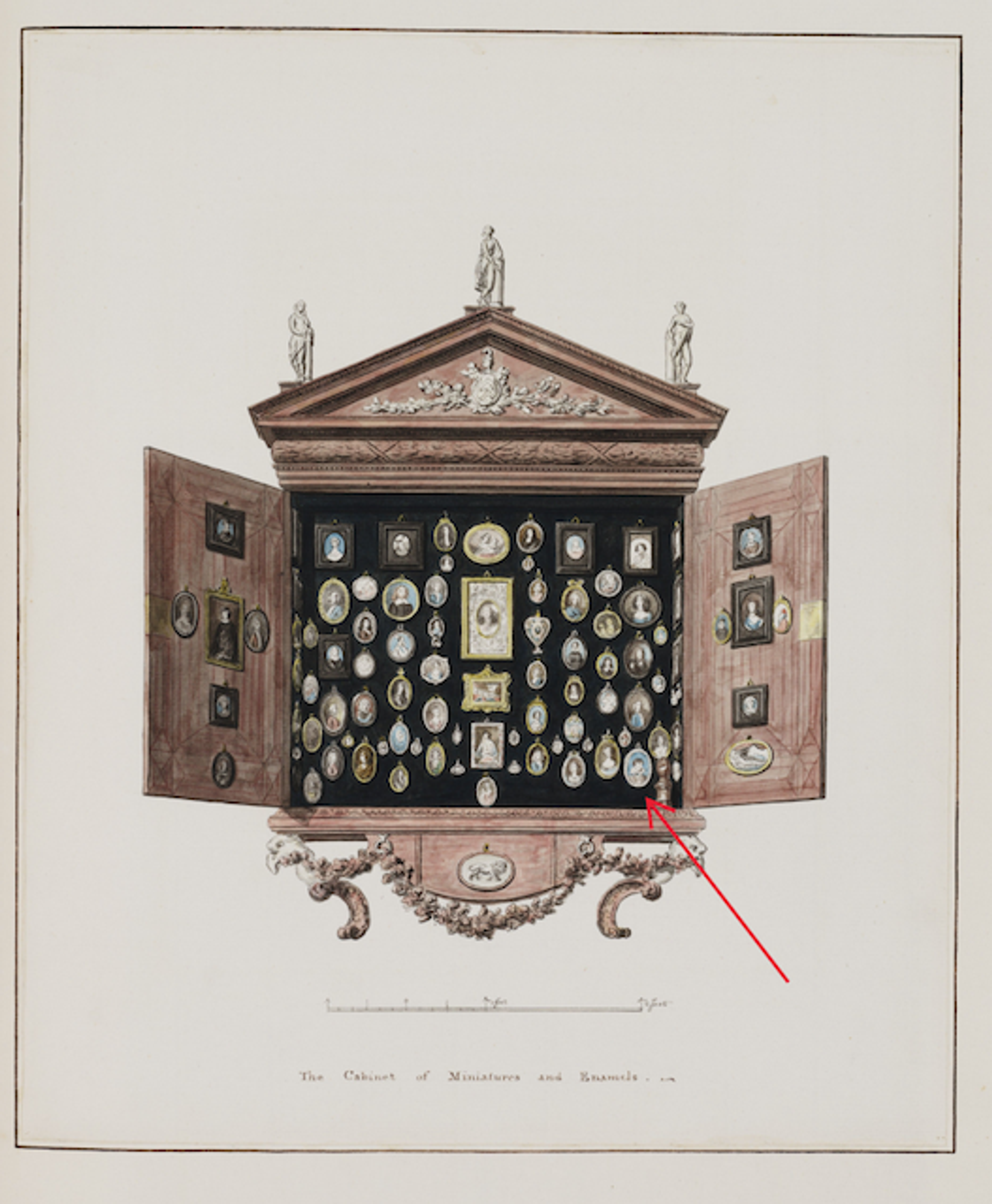 A drawing of a cabinet owned by Horace Walpole created by the architect and antiquary John Carter in around 1790. The Fontana miniature is shown in the bottom right