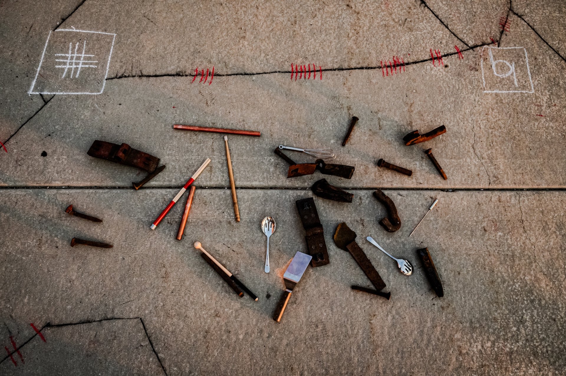 “We spent two full days on abandoned, old, historic railroad sites,” says Rojas. After Galindo found the first rusted spike, he knew what he was looking for. Eventually they uncovered enough discarded rail material to fill Rojas’s car. Galindo says each object is unique and can be dropped, rolled and rattled to create rhythms and textures.