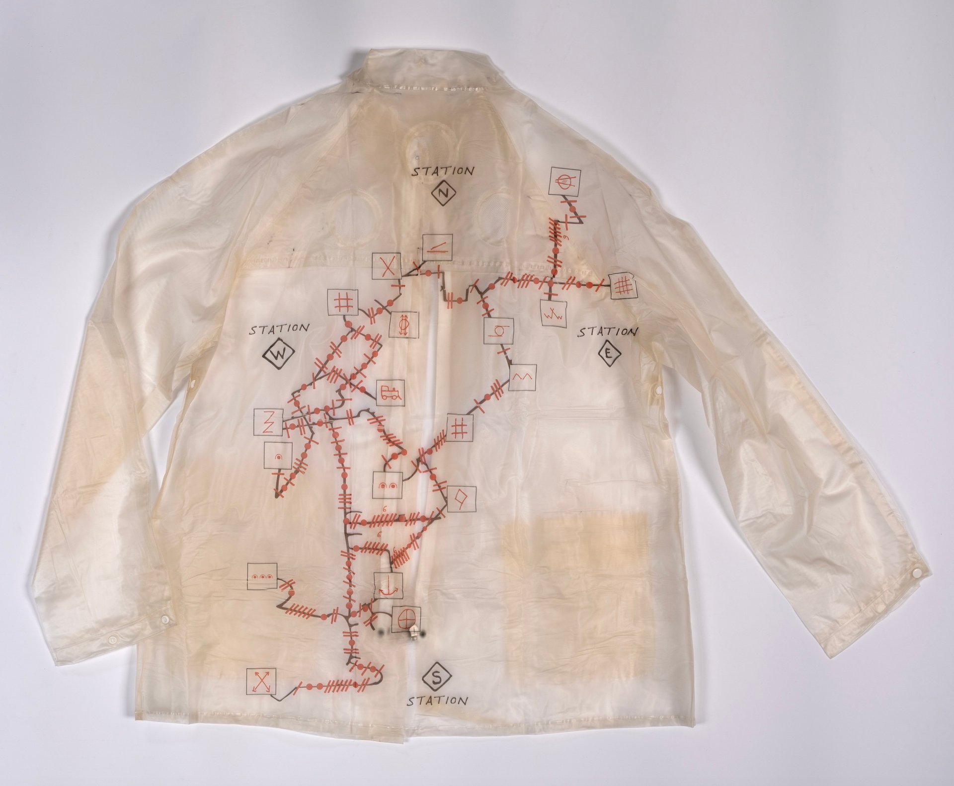 Caesura contains elements of sound, movement and visual expression as part of the exhibition The Other Side of the Tracks at 516 Arts in Albuquerque (until 8 February). Printed on a rain poncho in the gallery is a musical score that looks more like a map, with branching limbs instead of the traditional bars and measures. Punctuating pathways are hobo symbols combined with Western musical notations. For example, the fermata is as an arch over a dot, which resembles a known hobo code. Since the fermata signifies a rest, Chacon says that when considering the perspective of a traveller, the symbol could be an interruption, both physical and audible. “The score is a guide that provides a series of options,” he says. For the upcoming performance Chacon, Galindo and guest percussionist Alan Zimmerman will traverse the score, which will exist as a path on the ground.