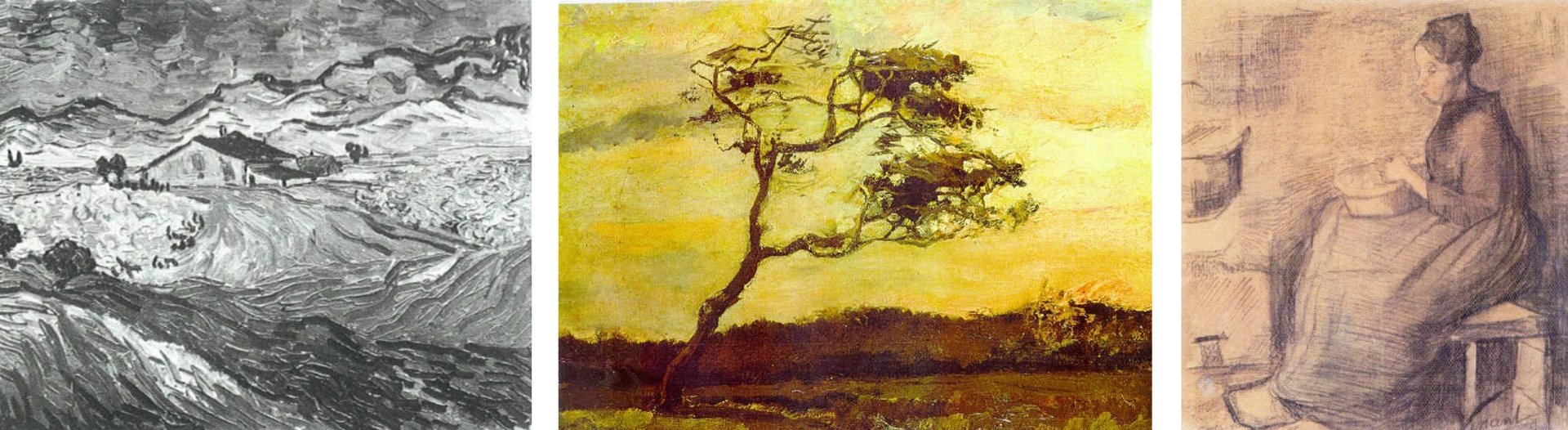 Van Gogh’s Landscape in the neighbourhood of Saint-Rémy (October 1889), A windblown Tree (August-September 1883) and Woman sitting by the Fire, peeling Potatoes (May-June 1885)