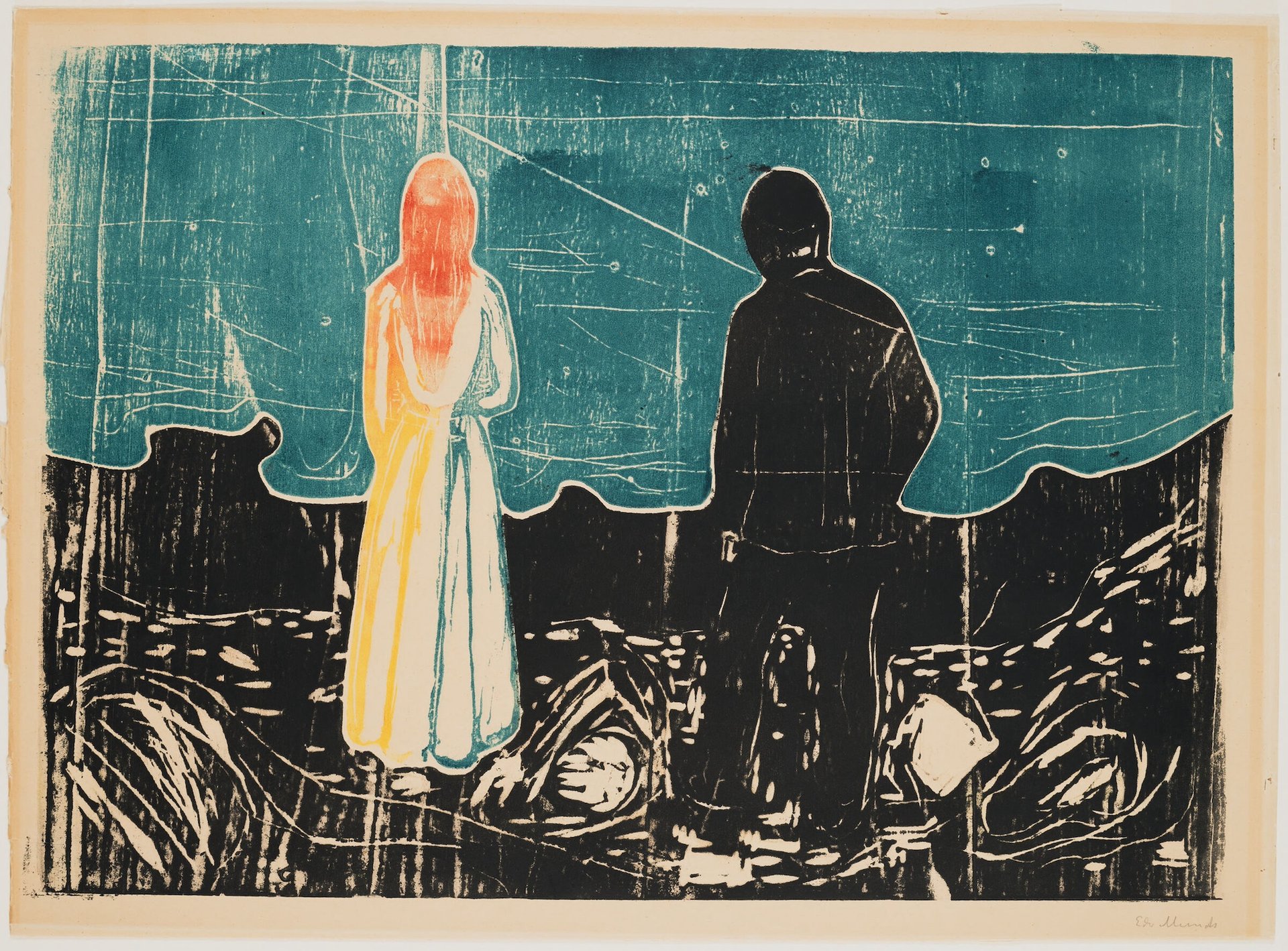 Edvard Munch, Two Human Beings (The Lonely Ones), 1899. Woodcut printed in orange, yellow, black and dark greenish blue on tan wove paper. Harvard Art Museums/Fogg Museum, The Philip and Lynn Straus Collection Photo: © President and Fellows of Harvard College; courtesy of the Harvard Art Museums