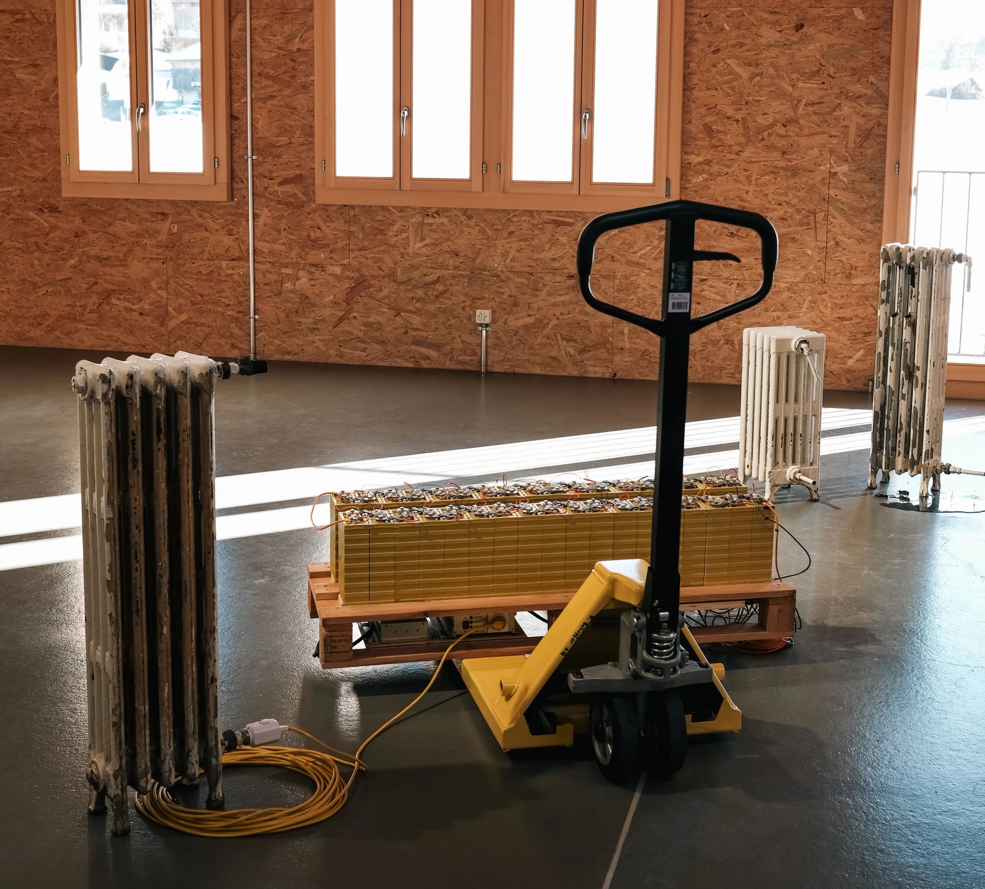 The artist, speaking during the show’s preview, points to the positive results of this exchange: butterfly pupae hang from a second radiator, their inhabitants having made a nest in the warmth during a previous iteration of the project. In Gstaad, she adds, the electricity is “bringing us some heat and we’re taking that energy with us as we go.”