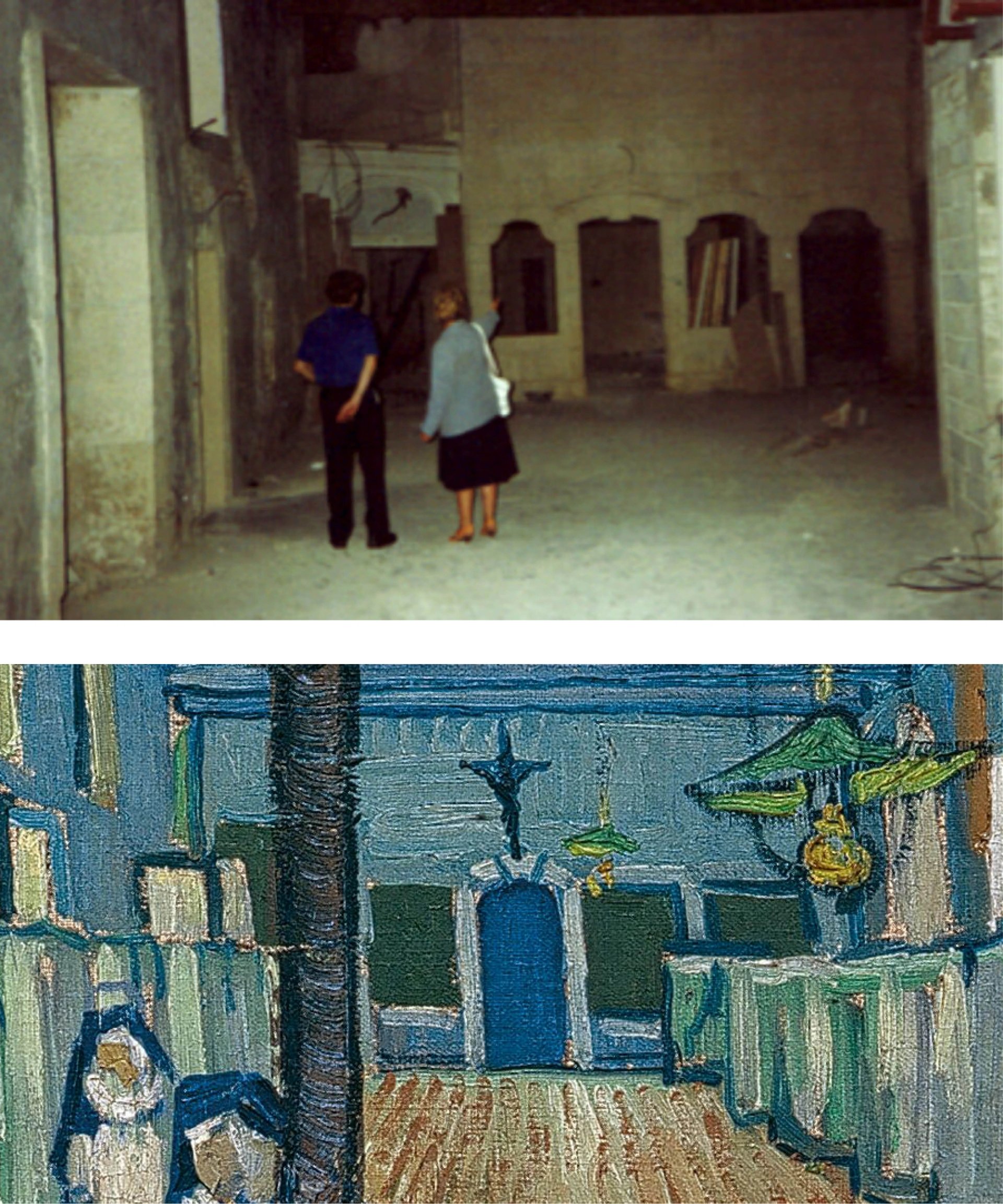 The former men’s ward in the old hospital in Arles, during demolition and building work (October 1988) and Van Gogh’s The Ward in the Hospital at Arles (detail)