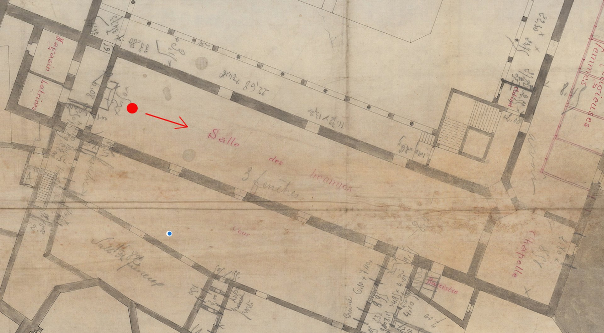 Detail from a plan of the Arles hospital by Auguste Véran dated 8 January 1889, showing the “Salle des hommes” (men’s ward) and with a red dot and arrow representing the view in Van Gogh’s painting