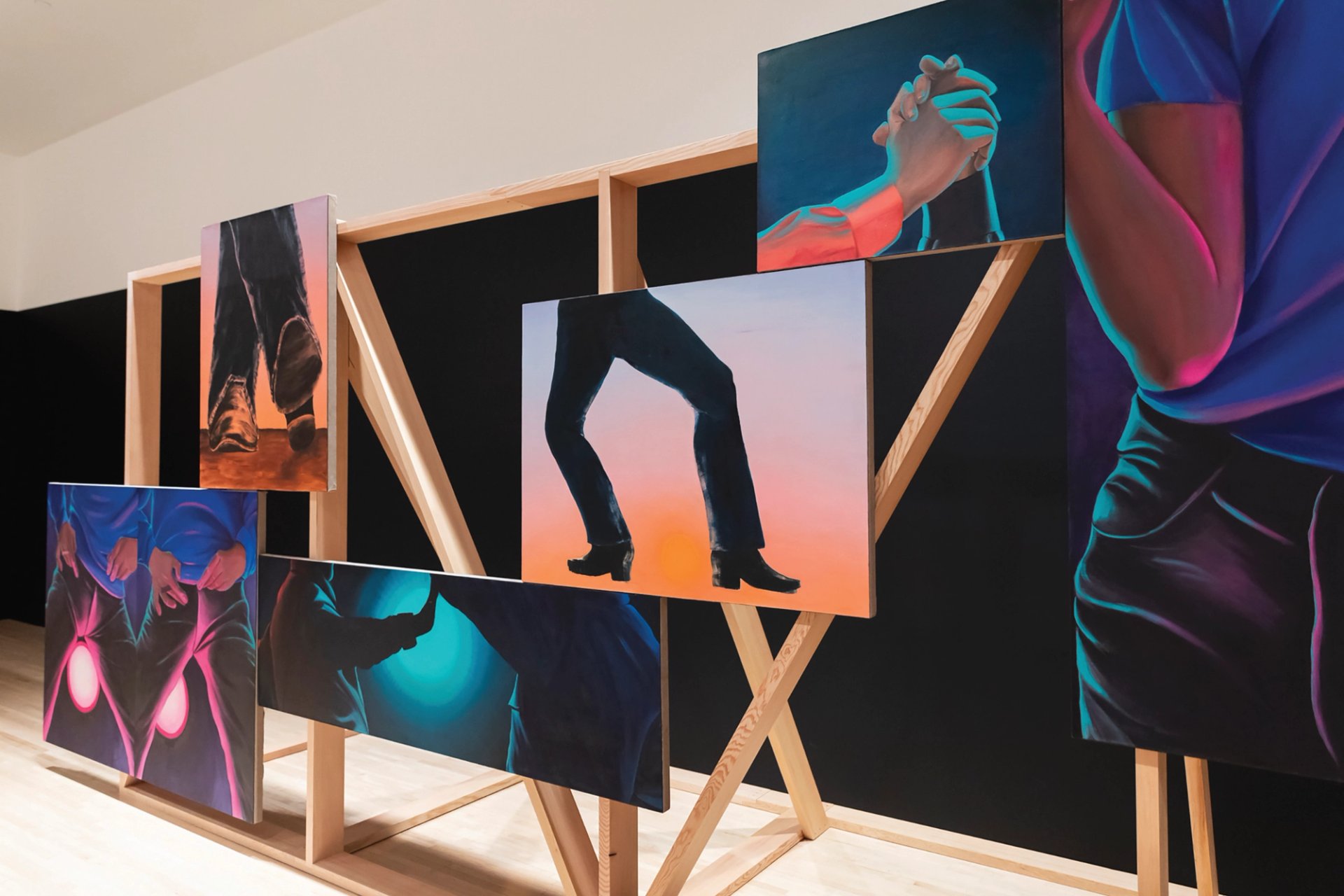 One of the suites of paintings is the dance montage, which is my favourite thing about 80s dance movies; I have this theory that, because of the advent of MTV, there was a visual language that contaminated mainstream movies—a lot of them are good, but they feel like an excuse to make a bunch of fun video clips. So I tried to hone into that montage language of very, very tight close-ups on the crotch and other body parts. Like, “How sexy, look at this person’s butt!”