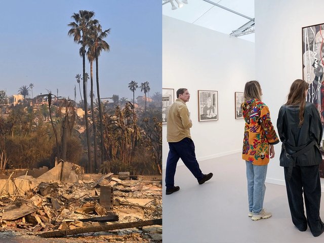 Since moving to Santa Monica Airport in 2023, Frieze Los Angeles has featured aeronautical art, from Basil Kincaid’s quilt-covered plane (2023) to this year’s aerial- choreography project by the artist Madeline Hollander and the Santa Monica Flyers flight school. Another project takes the theme citywide during this year's edition: a collaboration between the conceptual artist Coco Fusco, the gallery Mendes Wood DM and the out-of-home advertising company Orange Barrel Media, which has placed images from Fusco’s skywriting project Only in Darkness on digital billboards throughout Los Angeles. The displays feature azure skies punctuated with skywritten words and phrases like “Can you see the stars”, provoking reflection about the state of our environment.