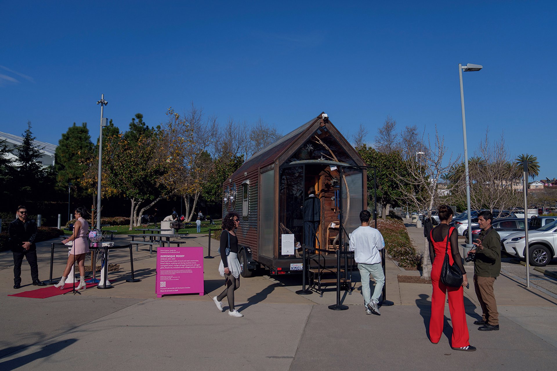 The artist Dominique Moody’s NOMAD project (2015-present), an art truck and trailer residing in the Airport Park directly next to Frieze, is a contemplative oasis amid the fast-paced art fair. Constructed from found and salvaged objects a decade ago, the dwelling has provided a space of creative refuge and self-determination for Moody and her community since its inception. Inspired by her father’s purchase of a trailer to protect his family and avoid segregationist persecution in the South in the 1950s, Moody’s project has served as both her home and a residency for those in need of “a nurturing space before entering the studio”, she says. A dreamy interior replete with personal history, the trailer is emblazoned with QR codes for fundraisers for Altadena-based artists and organisations affected by the wildfires. “As an assemblage artist, you take something ordinary and make it something extraordinary,” Moody says. Her father’s old globe is embedded above the trailer’s entrance, carefully painted with the words: “I wanted my children to be at home in the world.”