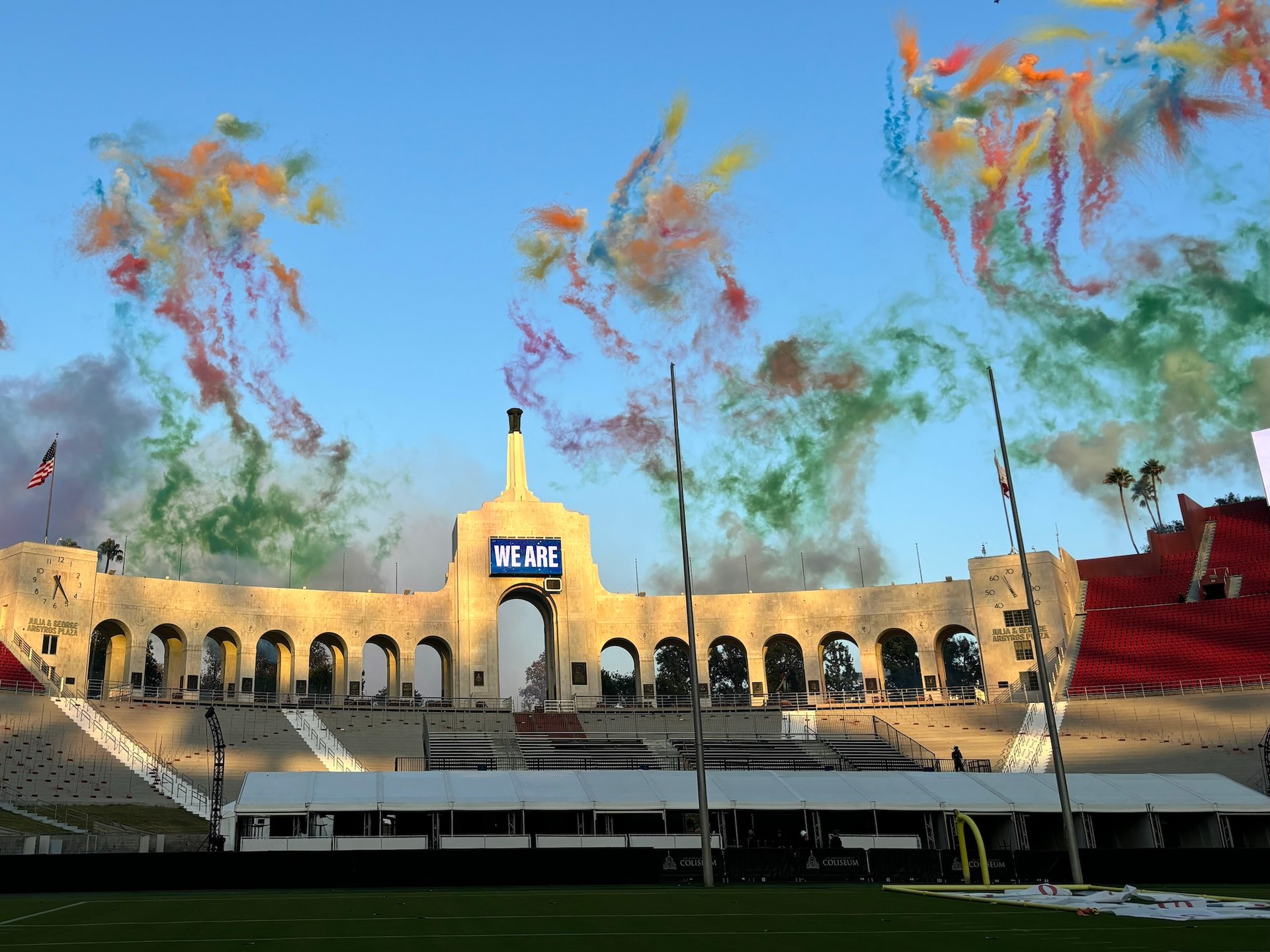 Colourful bird-of-paradise flowers seen above the Los Angeles Coliseum during WE ARE, which artist Cai Guo-Qiang's called his "gift to Los Angeles"