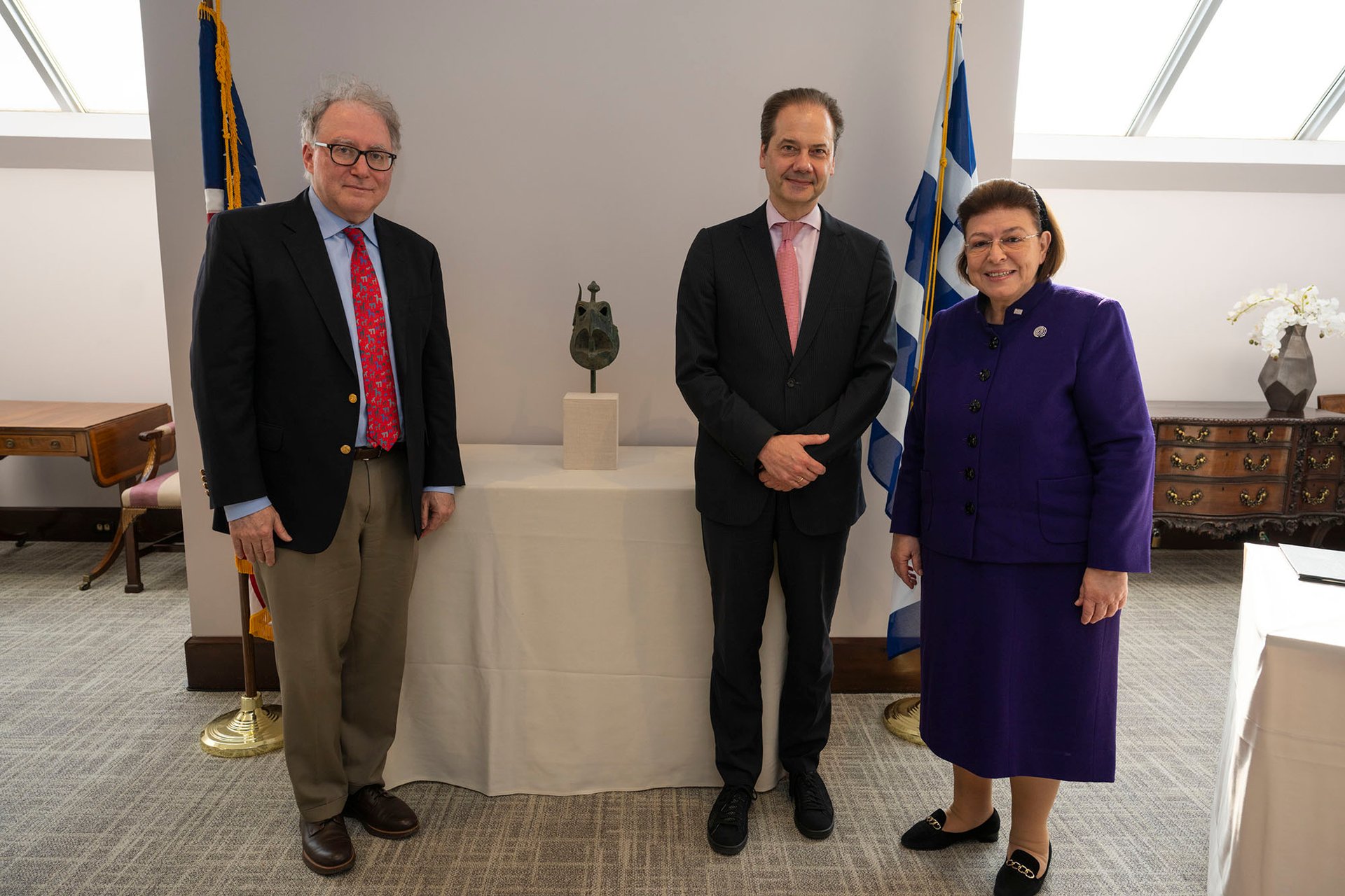 Officials from Greece, including culture minister Lina Mendoni, visited the Met on Monday for a repatriation ceremony for the griffin head. They were back at the museum on Tuesday for a panel about the museum’s collaboration with Greek authorities with regards to the collection of Leonard N. Stern. In 2022, Stern gifted his collection of ancient Cycladic art to Greece, and under the terms of a 25-year agreement a rotating display of the antiquities will remain on view at the Met.