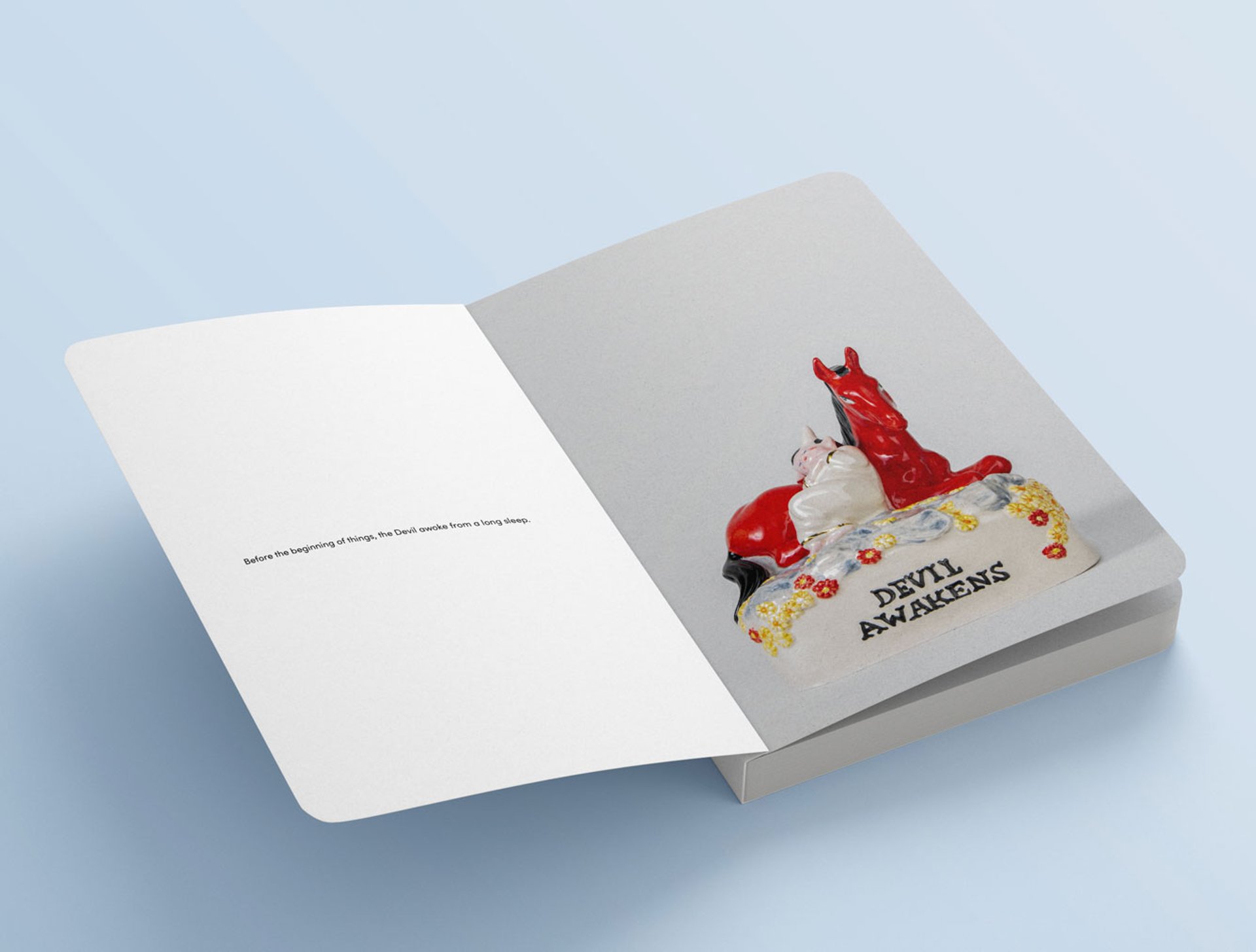 Now, in a somewhat surprising turn, Cave is exhibiting a series of ceramics inspired by Staffordshire flat-back pottery figures, which were popularised in the Victorian period. He began making the figurines during the Covid-19 pandemic, developing a series of 17 hand-painted sculptures that tell the life story of the devil. Cave exhibited them in a 2022 group show at the Sara Hildén Art Museum in Tampere and last year in a solo exhibition at Xavier Hufkens gallery in Brussels. They have now gone on show at the Museum Voorlinden in Wassenaar, Netherlands. In lieu of a catalogue, Cave has also written a short story using the ceramics as illustrations. The publication is printed on board, like a children’s book, so “you can wipe off the crushed banana”, he smiles.
