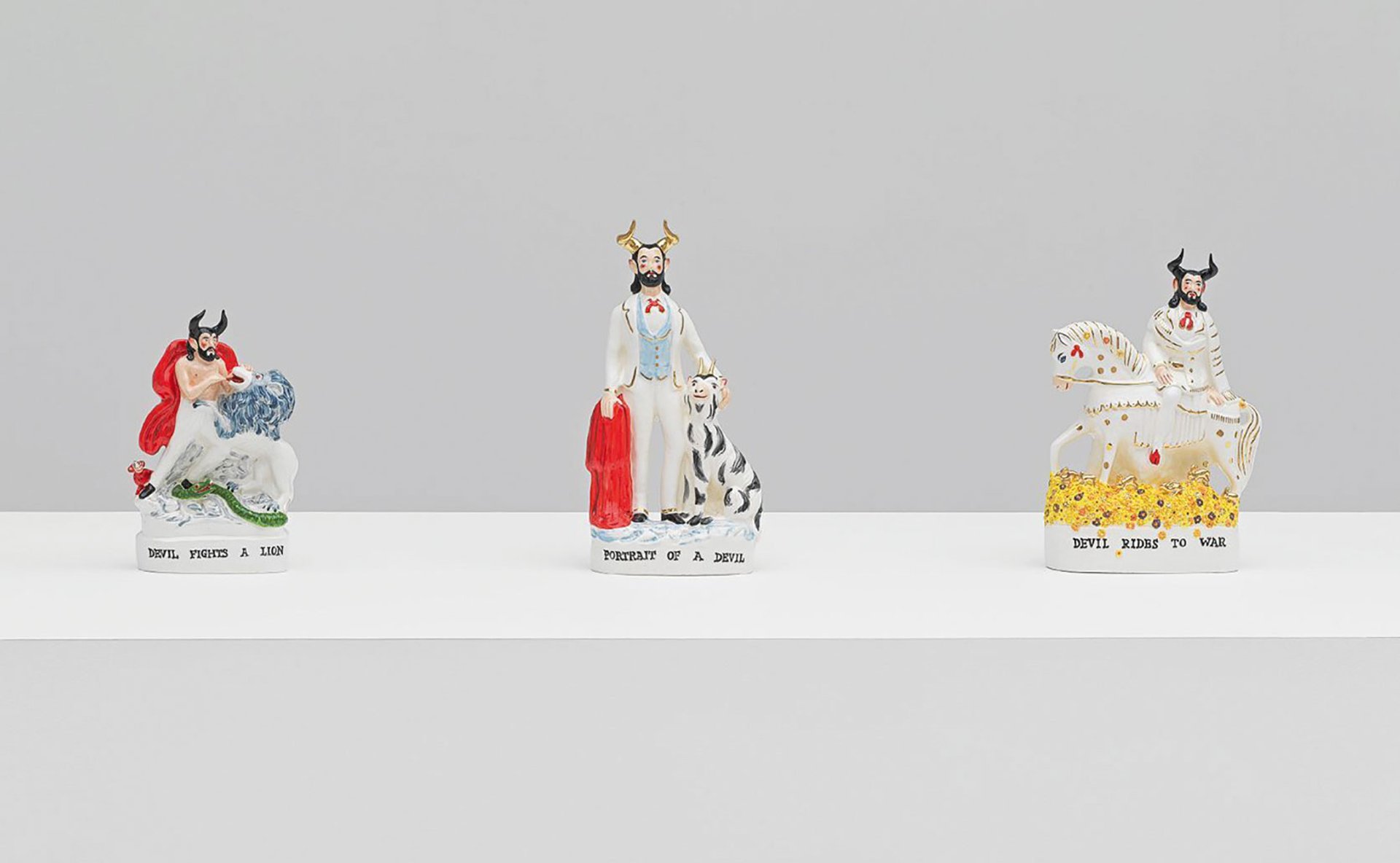 Each subsequent figurine that was made creates further meaning. The narrative grows. It felt like the story expanded and then I started to go backwards to his birth. And at the same time, looking at other Staffordshires that sort of suggested a narrative. Look, “Why doesn’t he go to war? I’ll do an equestrian.” A lot of Staffordshires are equestrian; different historical characters riding horses. “I’ll do that.” And so when he’s going off to war, “Why doesn’t he come back from war?” And now the devil’s changed. [After] going happily off to war in a field of flowers, he comes back wading through rivers of blood, a broken sort of individual. So the story just expanded, the meaning grew and it became, essentially, more personal.