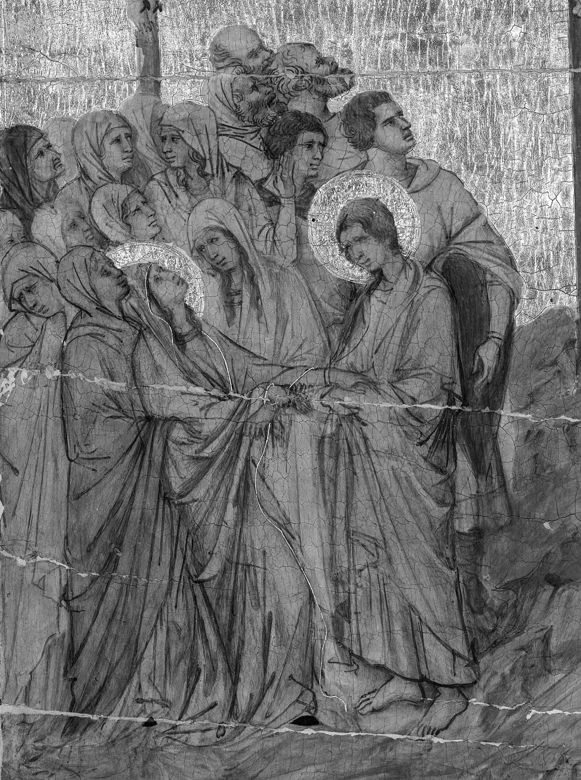 Detail of the crucifixion scene in Duccio di Boninsegna’s Maestà; analysed using infrared reflectography; detail 1600 nm. The scan shows freehand underdrawing using a liquid medium © Archivio Opificio delle Pietre Dure; Firenze