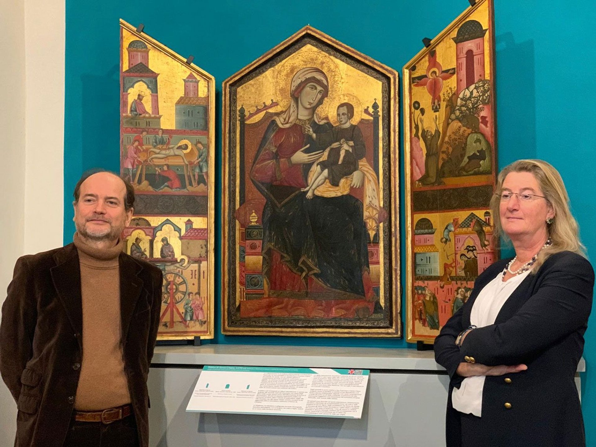 Axel Hémery and Cecile Hollberg, the former director of Florence’s Galleria dell’Accademia, with the Triptych of St Clare, which the two institutions reassembled Photo: Pinacoteca Nazionale di Siena