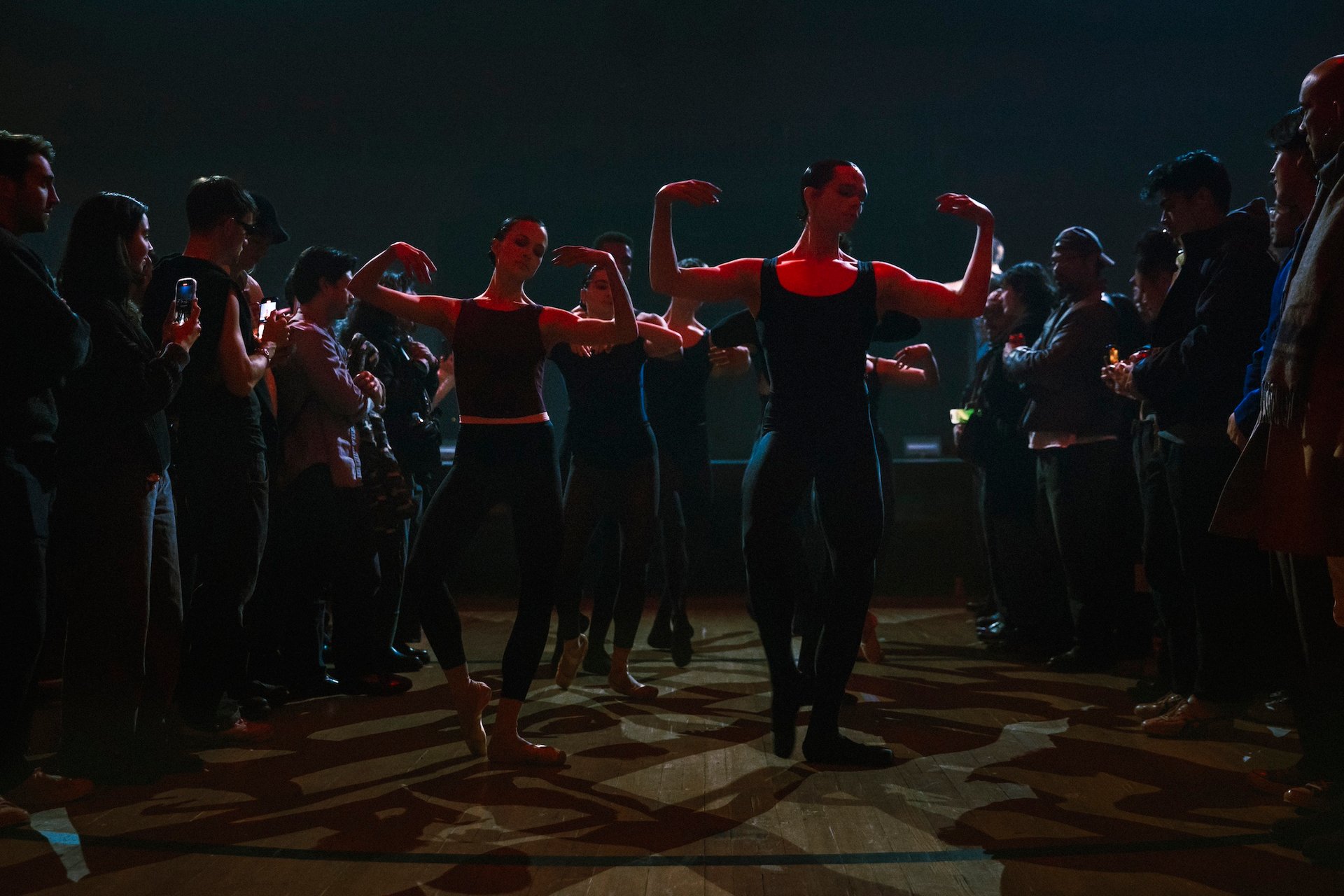 Moody and unpredictable, Imhof’s take-over contrasts the Gothic Revival former armory’s imposing interior with her uber-blasé orchestration of contemporary corporeality, conveying a mood of detachment, unpredictability and self-examination. More than 15 dancers cut through the roving audience within an expansive layout that resembles a high school gym with a time-ticking Jumbotron that hangs overhead, counting down to the end of the show. Two stages—one bare, the other decorated with silver balloons and mylar curtains—host intermittent live musical performances, while other performers climb over or sit atop 26 black Cadillac Escalades.