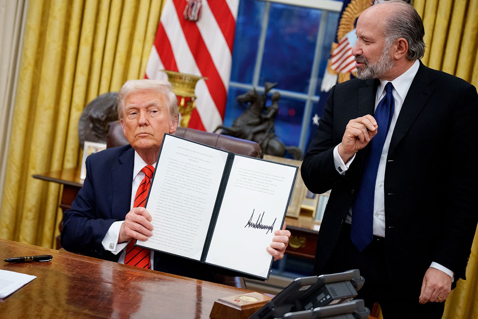 Donald Trump with his 10 February executive order on tariffs and the US commerce secretary Howard Lutnick