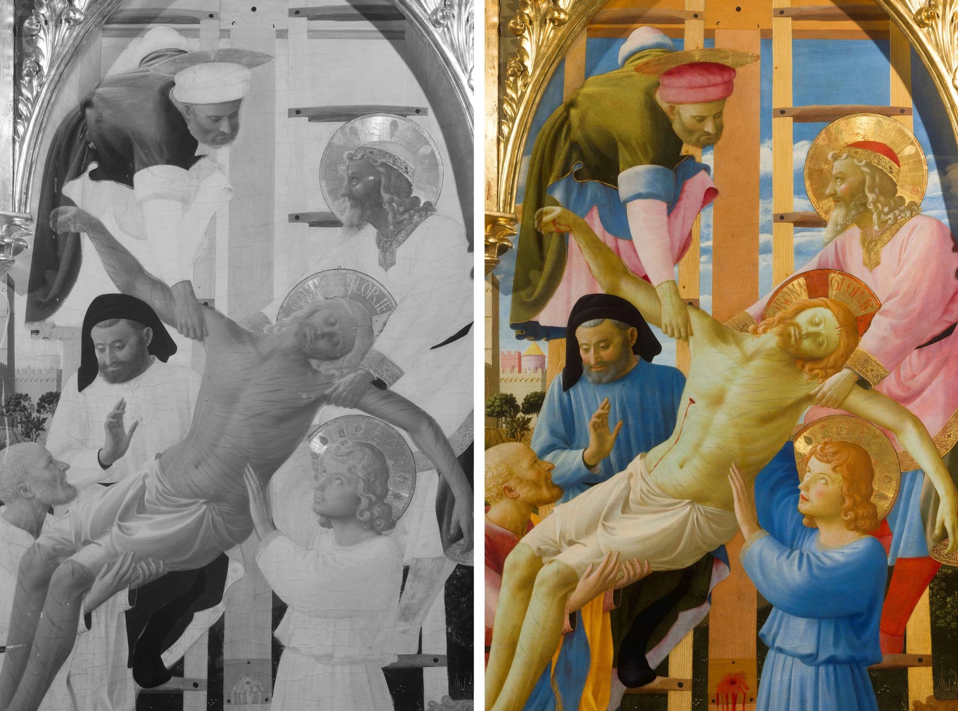 Left: the deposition scene under reflectography, which confirmed that Lorenzo Monaco had not worked on the central panel. Right: the scene after restoration Courtesy of Friends of Florence