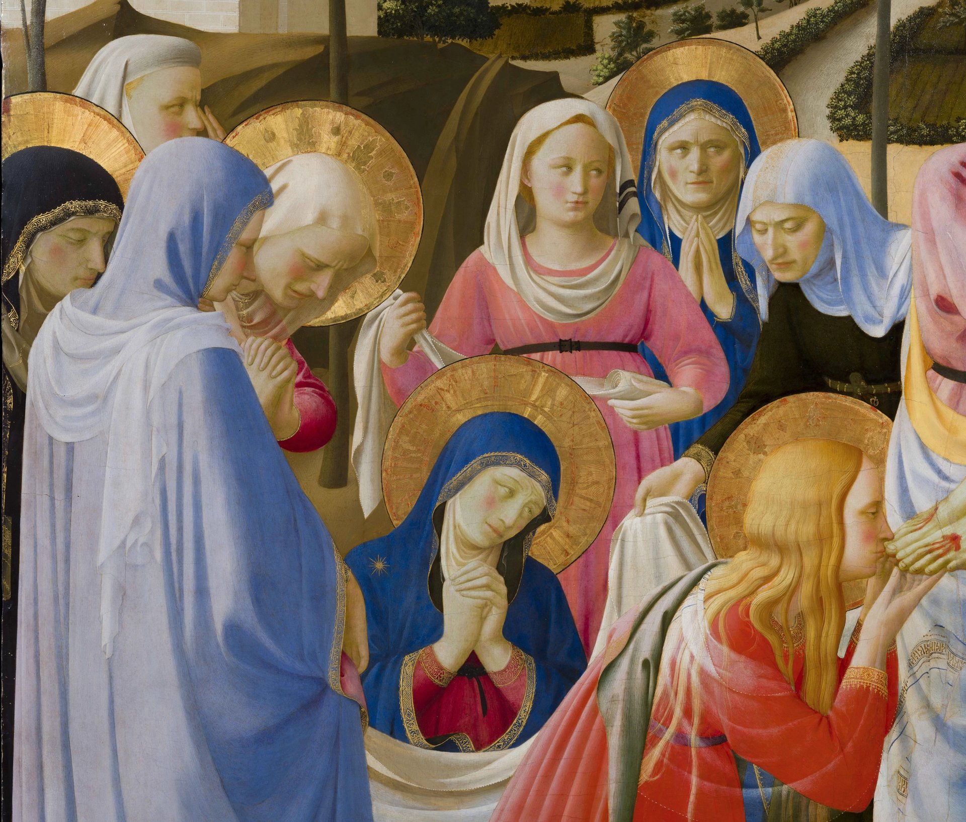 The altarpiece, now back on display in Florence’s Museo di San Marco, was originally commissioned by the Italian banker and politician Palla Strozzi for his family chapel, the church of Santa Trinita. It depicts Christ being taken down from the cross by four men, with a large crowd gathered around them and an undulating landscape in the background. Mary Magdalene is shown kissing Christ’s feet, while in the foreground a kneeling figure—possibly the Blessed Alessio Strozzi—stretches a hand out to the viewer. Scenes of Christ’s life, painted by Fra Angelico’s mentor Lorenzo Monaco, and depictions of saints surround the central image.