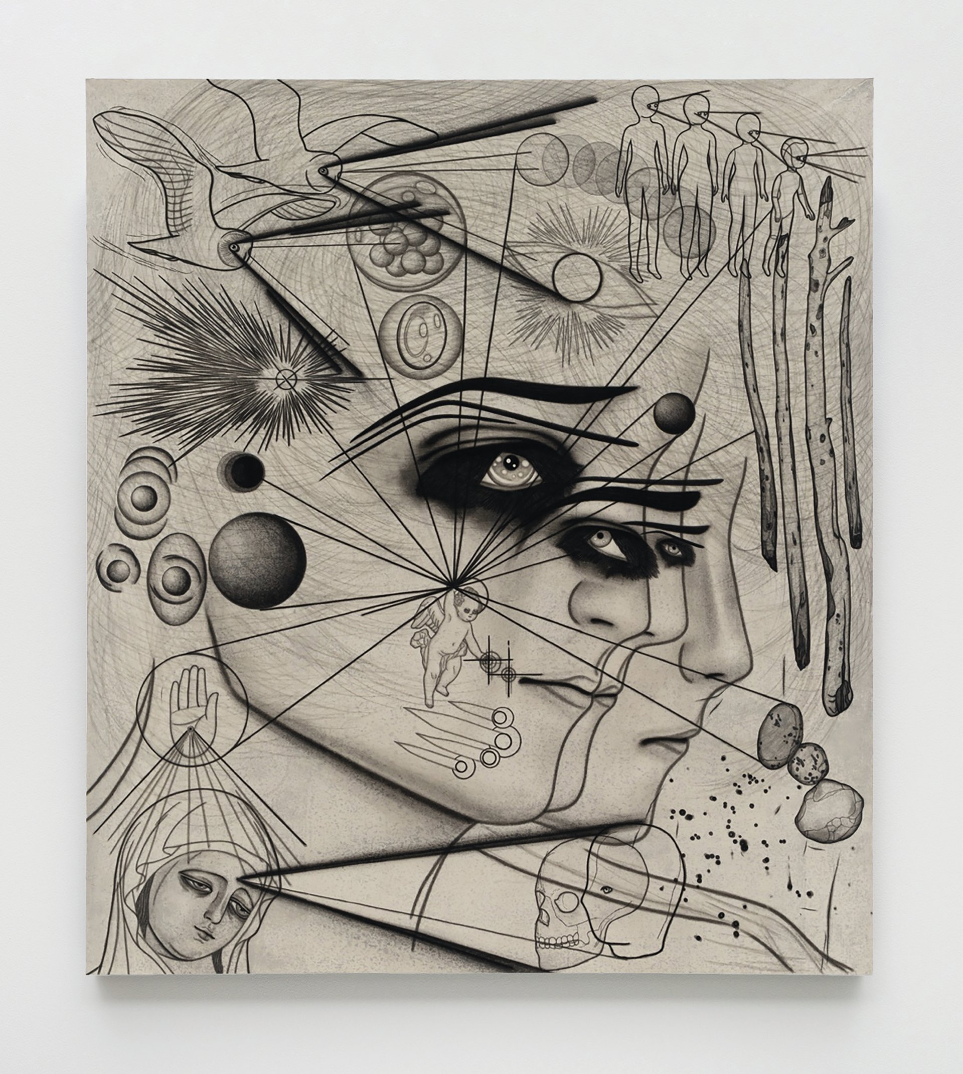 Jungwook Kim’s esoteric ink-wash paintings are all about connection. In Untitled (2023) a mix of religious figures, stars, birds and other, more mysterious, subjects come together to form a composition which—taken as a whole—bring to mind themes such as the different layers of perception and the relationship between humanity and the rest of the universe. One recurring motif is the “eye, which serves as a conduit for energy, with beams extending from its gaze”.