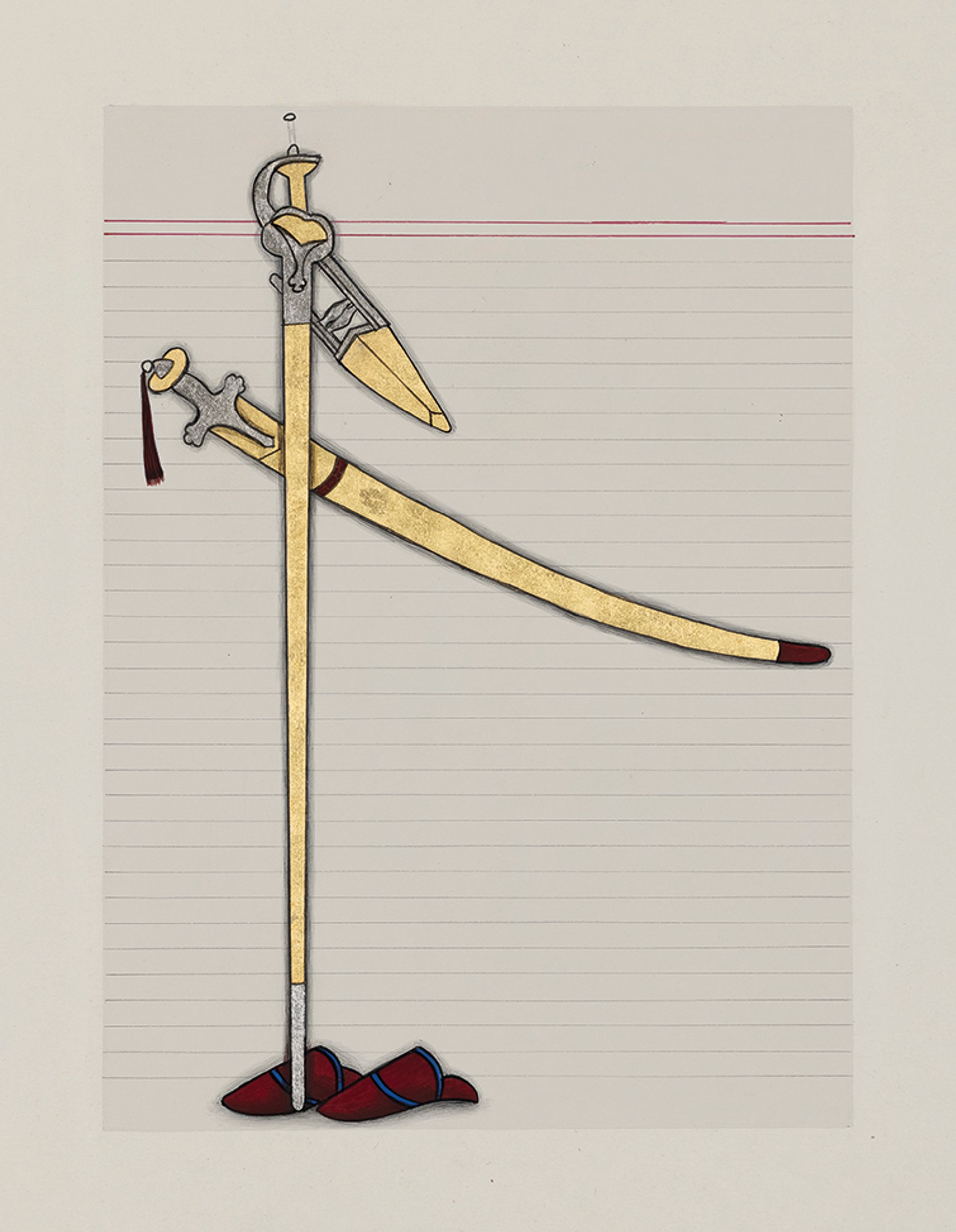 Khalid, who is based in Pakistan and trained as a miniaturist, explores various dualities in her work. In her series I Am and I Am Not (2023), for example, she turns sheets of wasli—handmade paper used to create miniatures over the centuries—into what resembles contemporary notepaper, filling them with colourful, delicately painted gouache motifs referencing hope, violence and mourning.