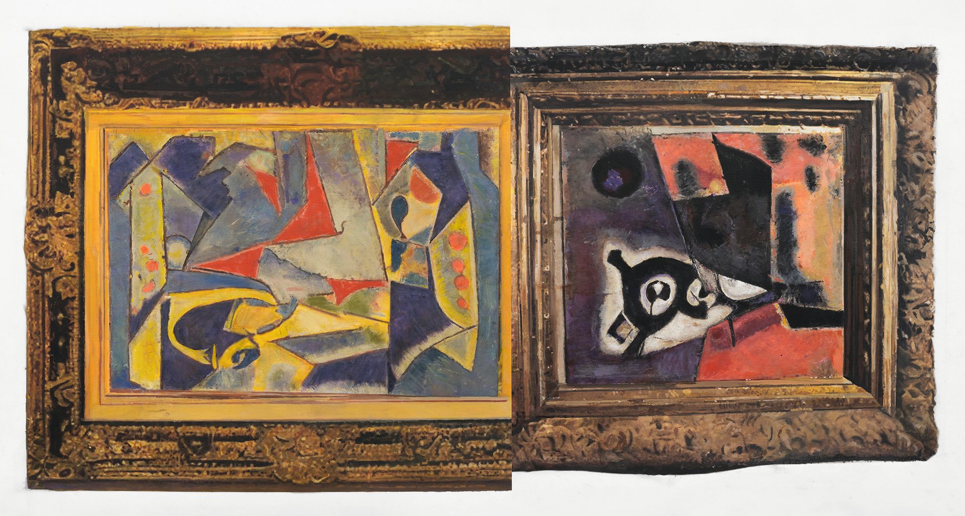 At first glance, the two works making up Australian artist Diena Georgetti’s Surgeon’s Playlist (2025) look “very traditional”, resembling abstract Modernist paintings akin to those of Kazimir Malevich or Wassily Kandinsky. In fact, their compositions are based on collages of images drawn from the internet, drafted with the assistance of AI software. The artist then painted them, and their historical-looking ‘frames’, in synthetic polymer paint on canvas, creating an interesting conceptual balance between old and new. “We’re probably going to be surprised when we see [the piece] in person,” says De Bellis.