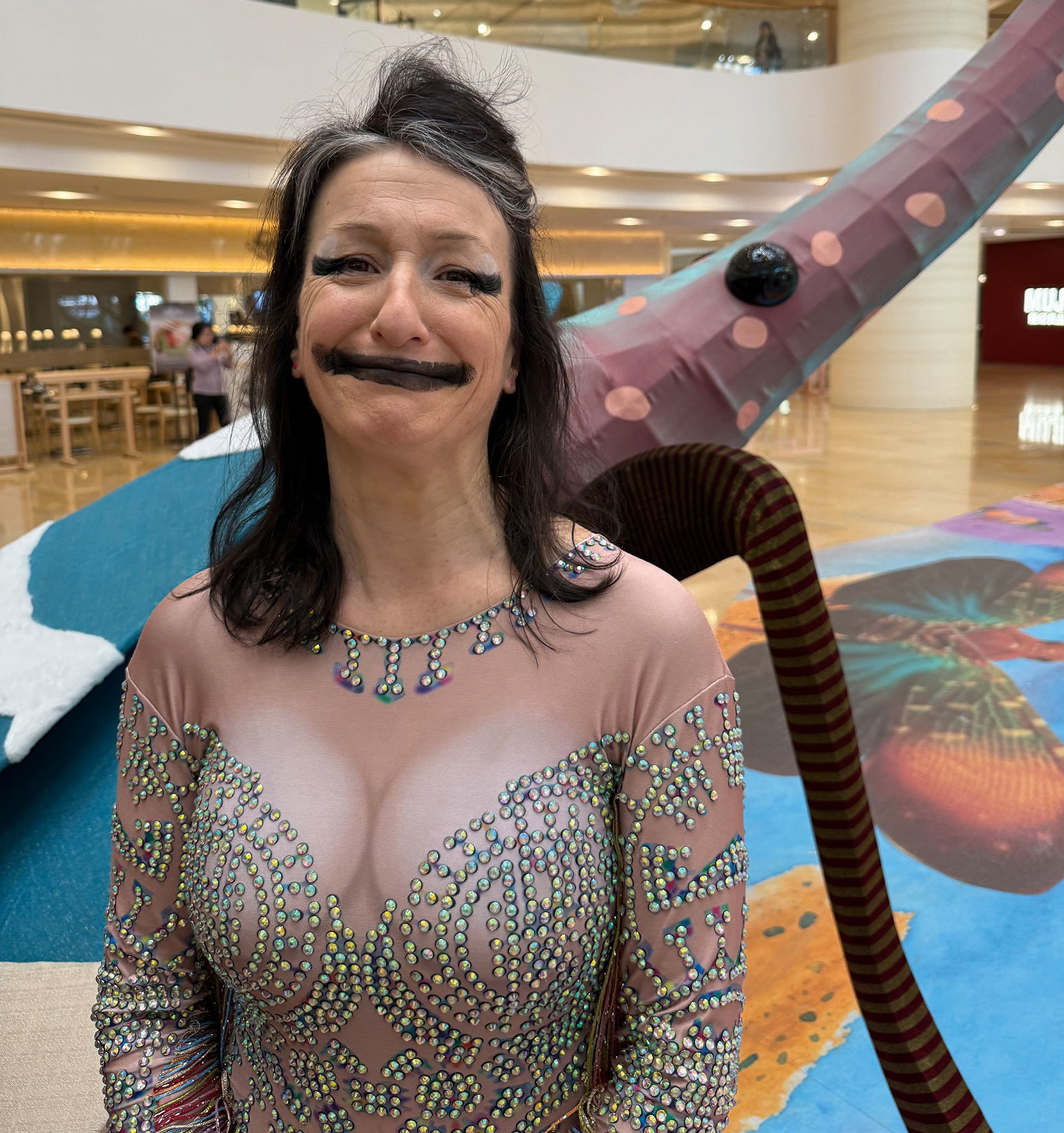 The UK artist Monster Chetwynd is causing a stir with her off-site Art Basel Encounters installation, which transforms the high-end shopping mall, Pacific Place, into a magical lily pond dotted with three large, glittery lanternflies. “When I saw pictures of Pacific Place, a shopping mall with a kind of big central basin, the architecture made me think of a fun, lily-pad pool,” Monster says.