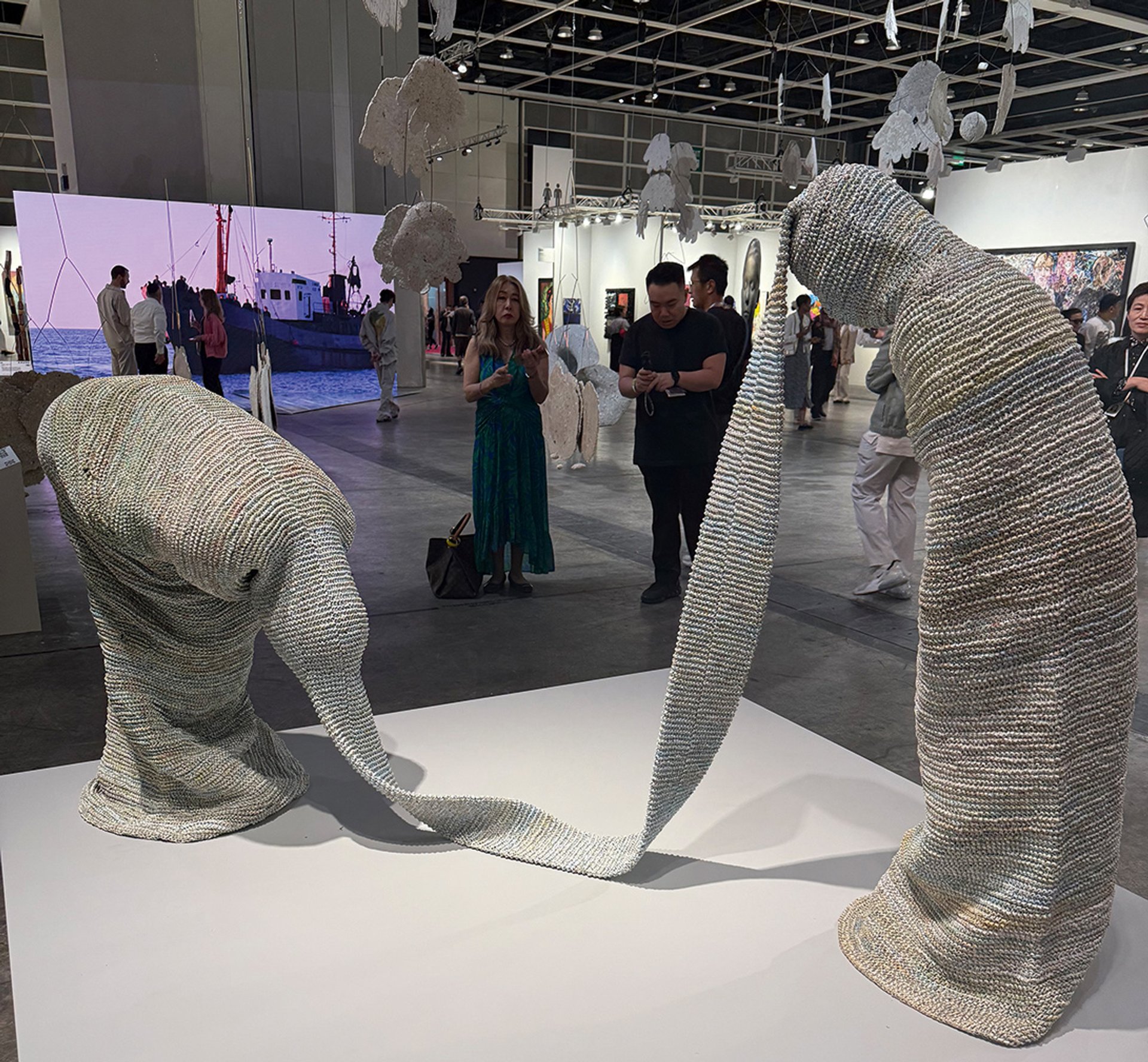 The artist Movana Chen’s Dreconstructing piece in the Encounters section of Art Basel Hong Kong is full of weird and wonderful works including 24 wearable garments knitted from shredded magazines. But a particular aspect is drawing crowds, namely a performance called Questioning the Line, which features Chen herself and the dancer Francisco Borges. Encased in a single body stocking made of knitted, shredded travel documents, the pair move and interact in front of bemused fairgoers.