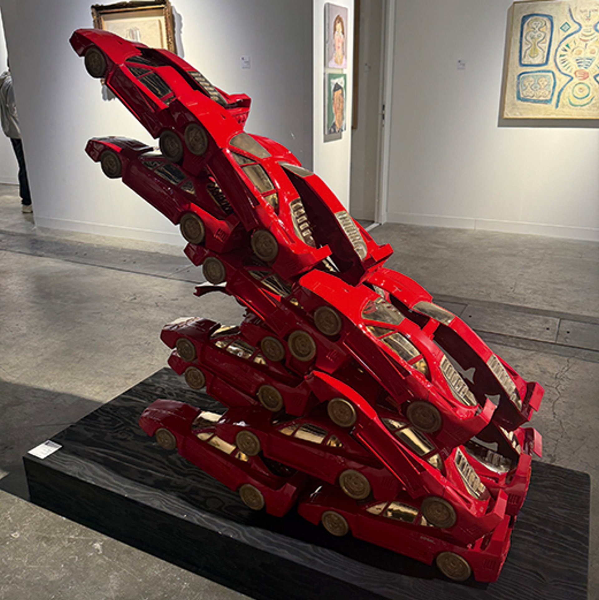 Fans can view the exquisite mini motors plus the latest (real-size) BMW car designed by Julie Mehretu on the top floor of the fair. Car-crazy collectors can also salivate over a sculptural ensemble of Ferrari F40 models on sale at Galleria d’Arte Maggiore. This stack of shiny red cars by the artist Arman has a compelling back story. Franco Calarota, the gallery chairman, suggested to Ferrari in 1999 that Arman build a public monument, which was installed at the entrance of the Enzo and Dino Ferrari racetrack in Imola, Bologna.