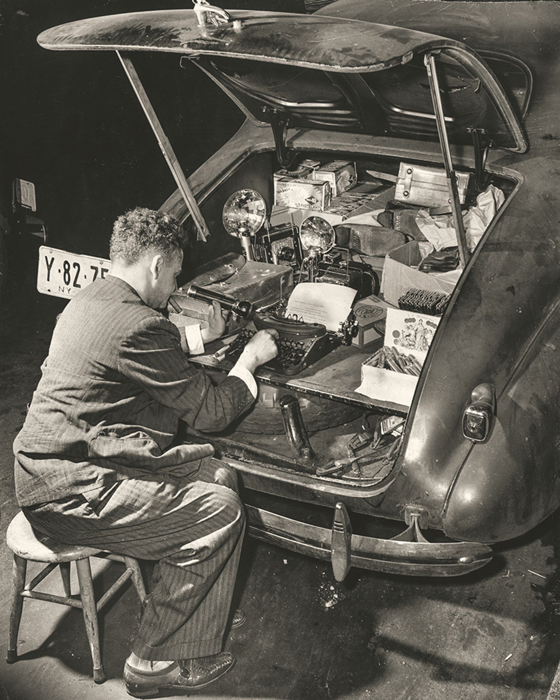 Weegee at the Typewriter in the Trunk of the 1938 Chevrolet, New York (around 1943) © Weegee Archive/International Center of Photography, New York