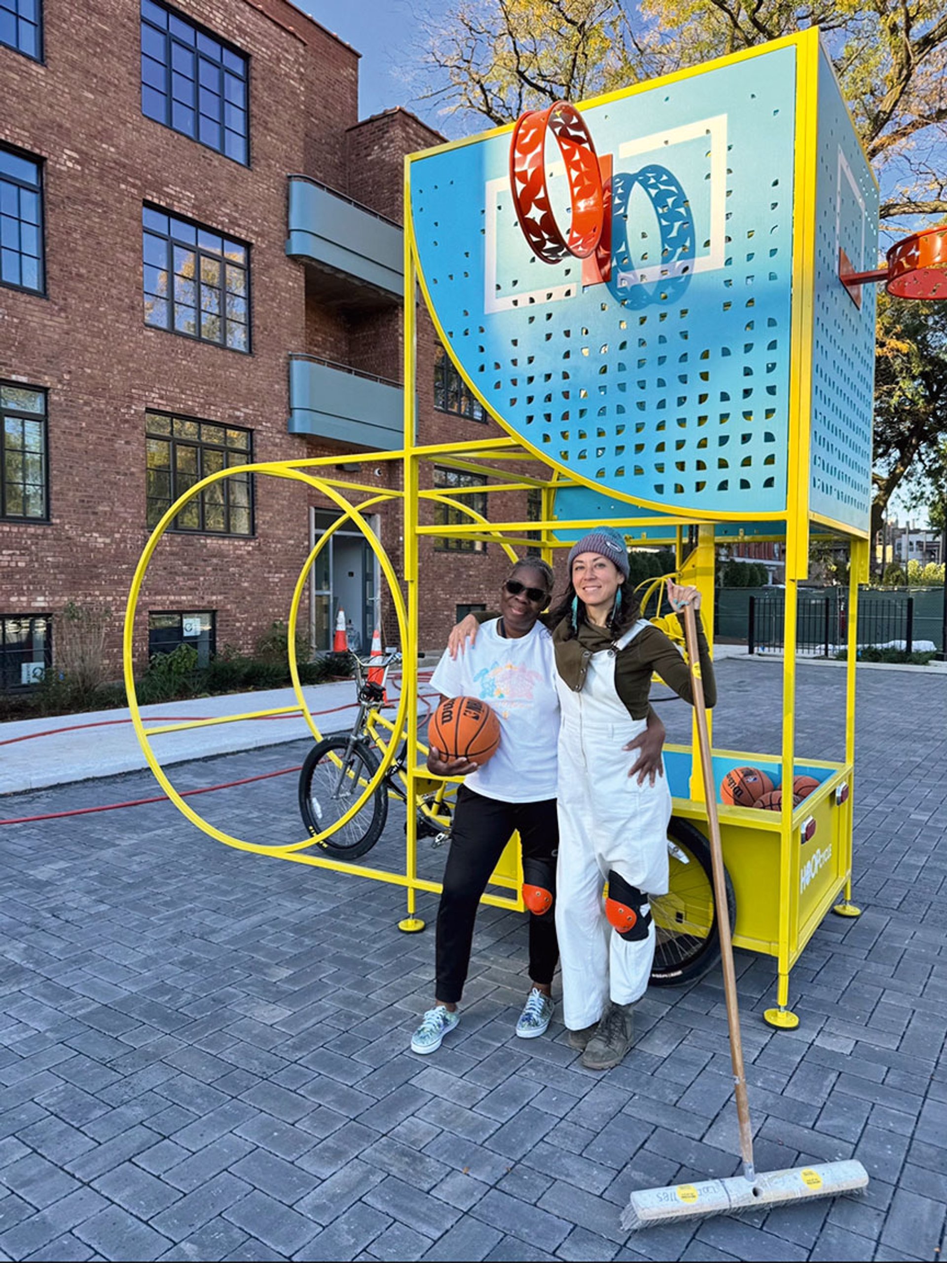 Marisa Morán Jahn (right) and Miss Elaine, a Chicago public housing resident, with HOOPcycle, a mobile interactive art installation