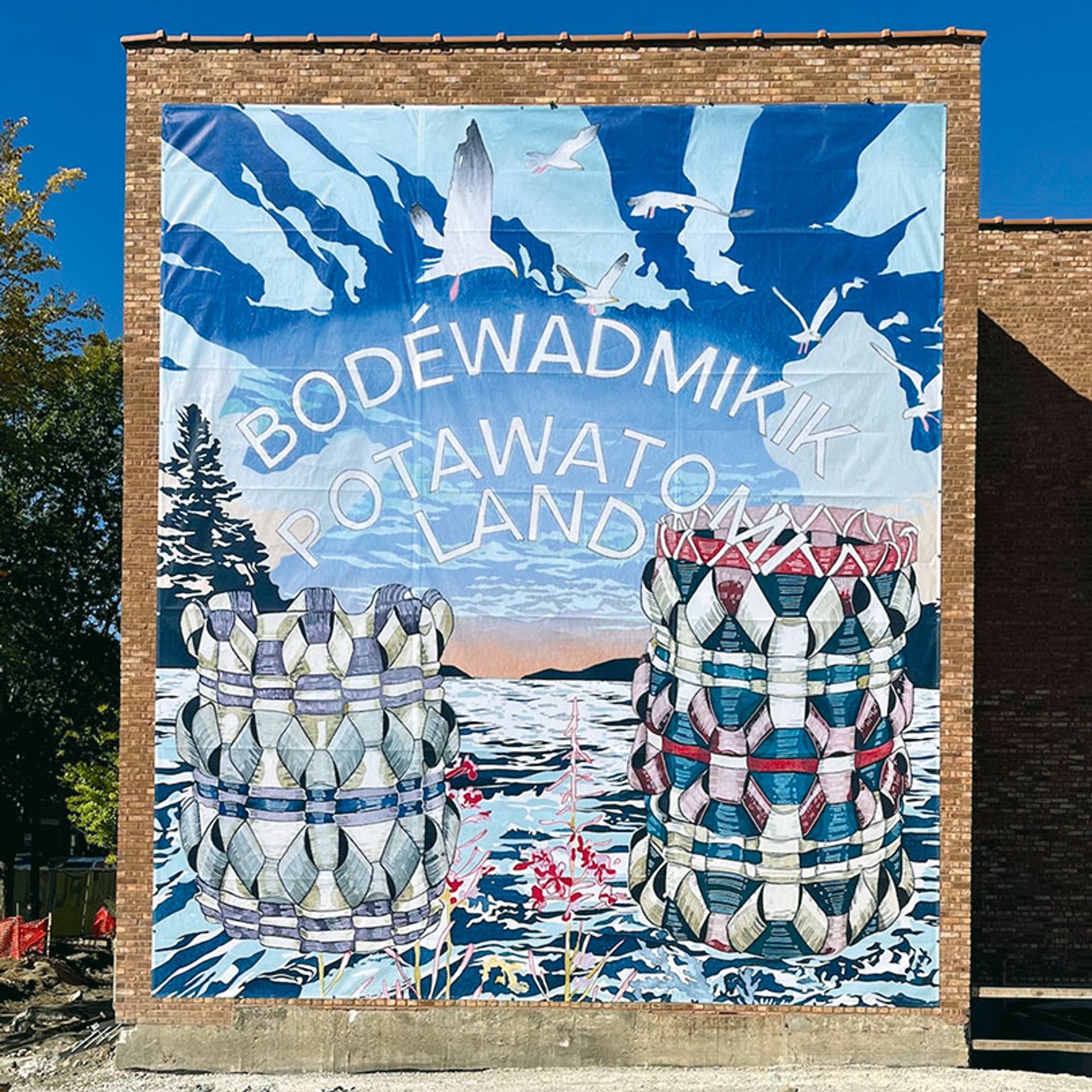 One highlight of the exhibition was the 40ft-tall work Still Here: Zhegagoynak, by the Ojibwe artist Andrea Carlson, suspended on an exterior wall of the building and linking the history of displacement of Indigenous communities with the redlining (withholding of financial services) of African American communities. It features lettering in Potawatomi and English, taking words from treaties that caused displacements, such as the 1821 Treaty of Chicago, the 1816 Treaty of St Louis and the 1795 Treaty of Greenville.