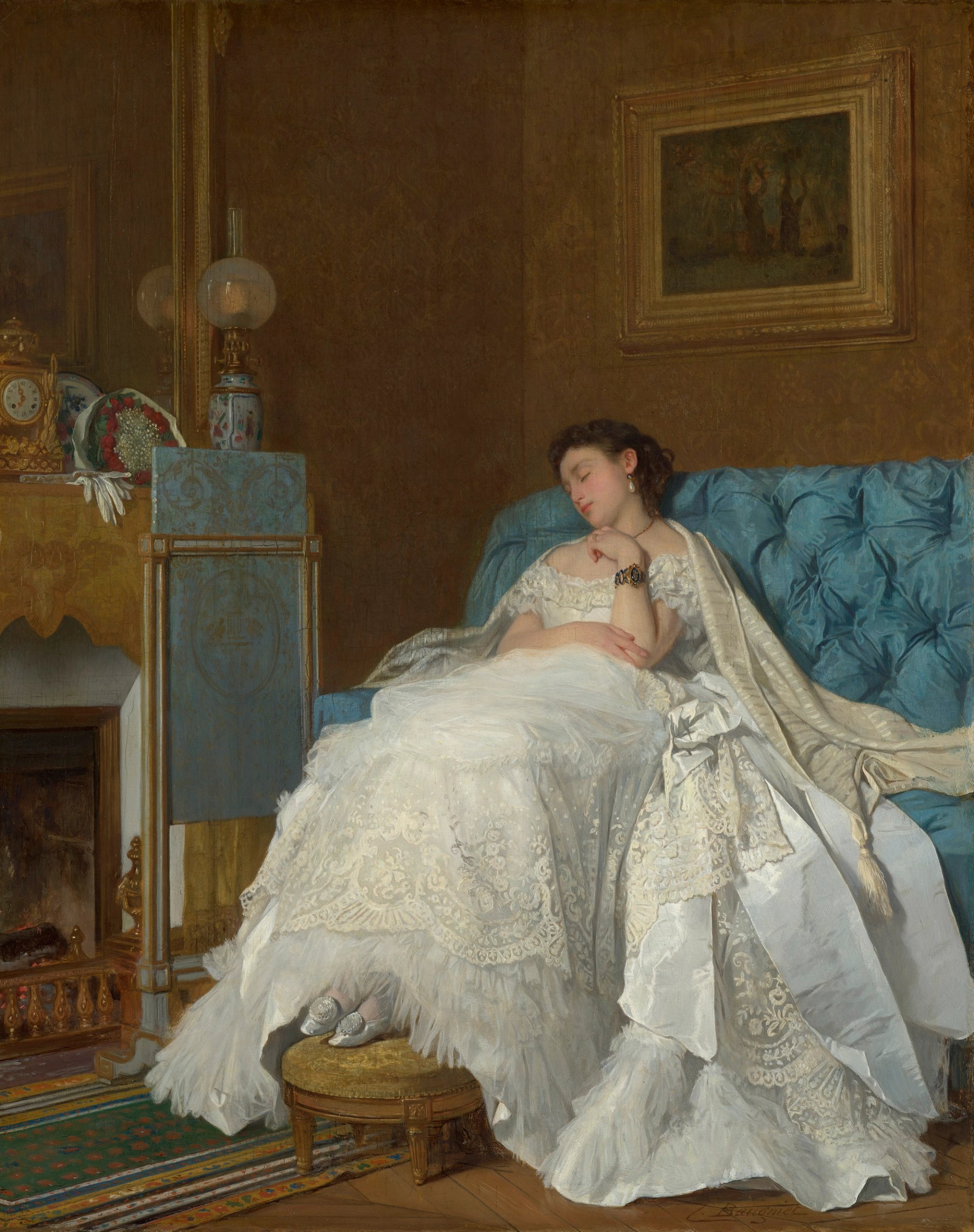 Charles Baugniet’s After the Ball: a Lady in a Ballgown Asleep on a Sofa (around 1860-67), from the exhibition © Royal Collection Enterprises Limited 2025; Royal Collection Trust