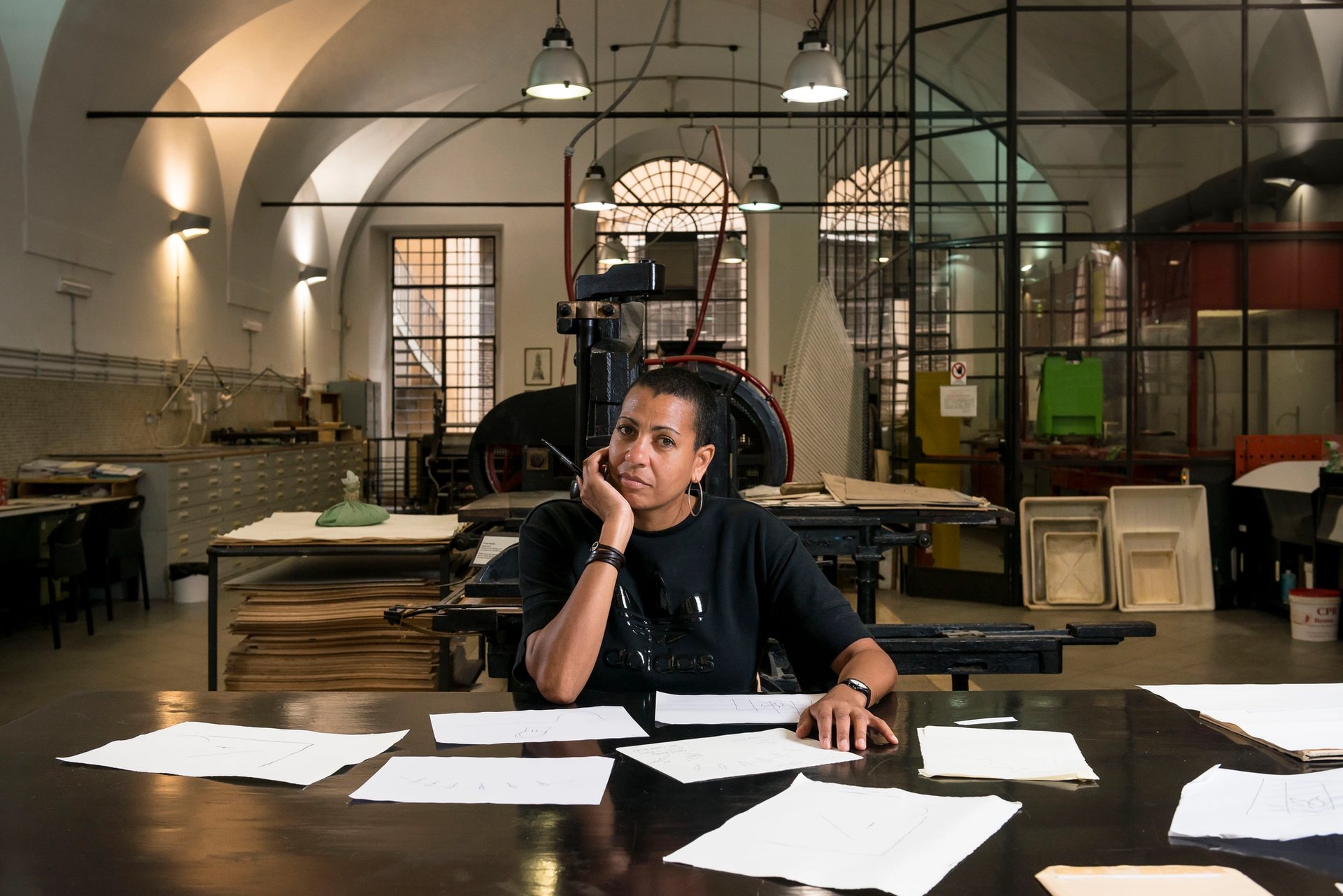 Helen Cammock, who went on to co-win the Turner Prize after the Max Mara, at the engraving laboratory of Istituto Centrale per la Grafica of Rome during her residency Courtesy Collezione Maramotti. Photo: Sebastiano Luciano