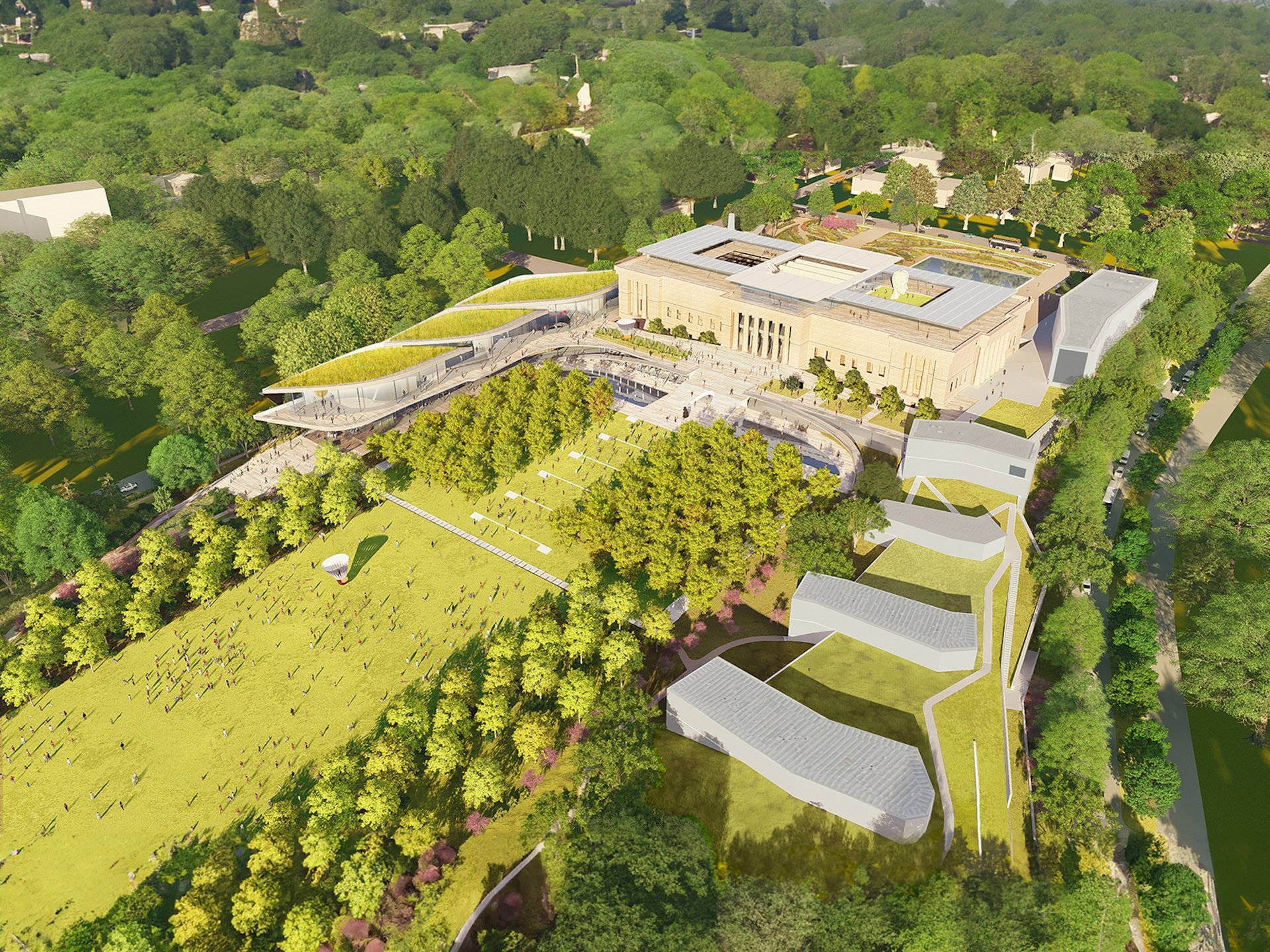 An aerial rendering of the Weiss Manfredi's new wing (at left) for the Nelson-Atkins Museum of Art in Kansas City Courtesy The Nelson-Atkins Museum of Art