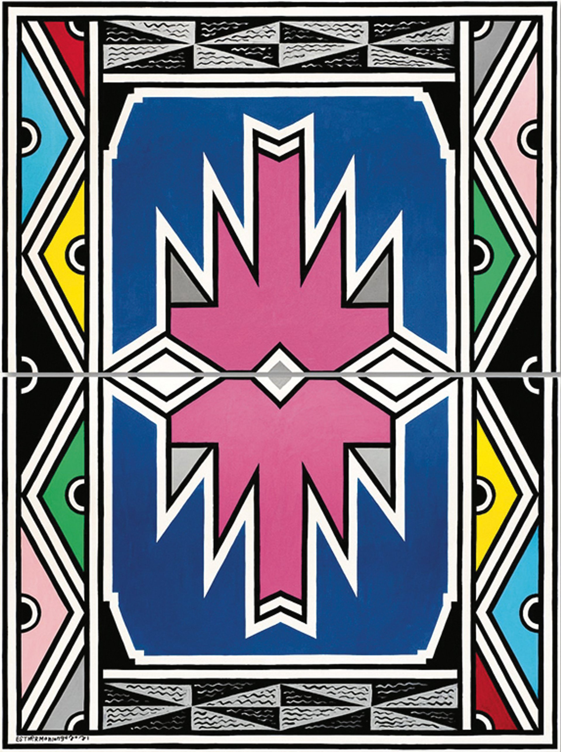 The South African artist Esther Mahlangu’s Ndebele Abstract (Diptych) (2021) pops with colour and geometry on Jenkins Johnson Gallery’s Frieze stand