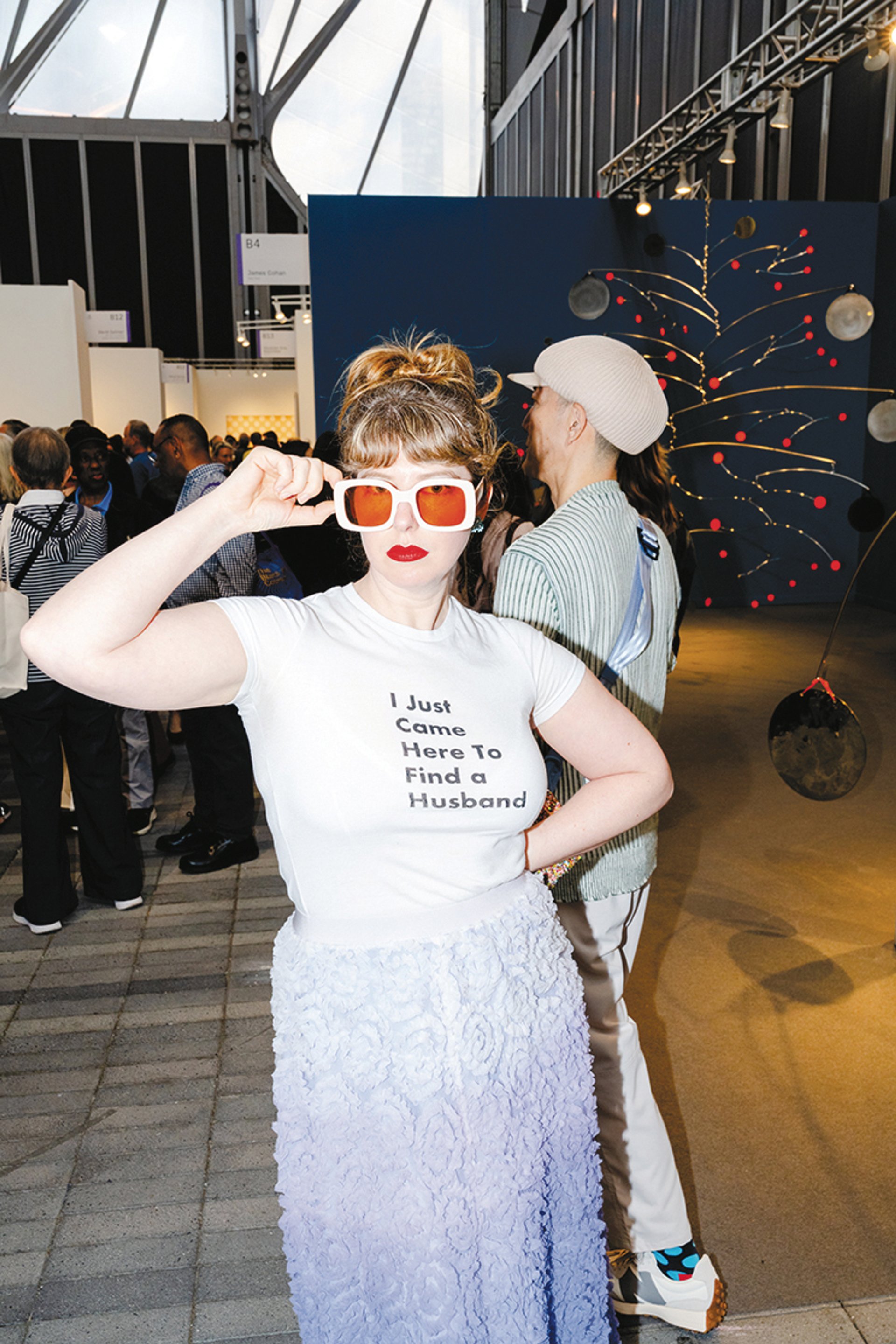 T-shirts and sweatshirts are the fashion statements at Frieze this year, with several jaunty examples on show in the aisles. We spotted a cheeky shirt sporting “Wikipedia editor in chief”, but our prize for top attire goes to the artist Lauren Cohen. She was turning heads while wearing a T-shirt emblazoned with: “I just came here to find a husband.” Cohen says the shirt comes courtesy of the artist Ayana Evans, and she’s sticking to her brief. “There are men over 60 who are interested. My cut-off age is 54, though,” she quipped.