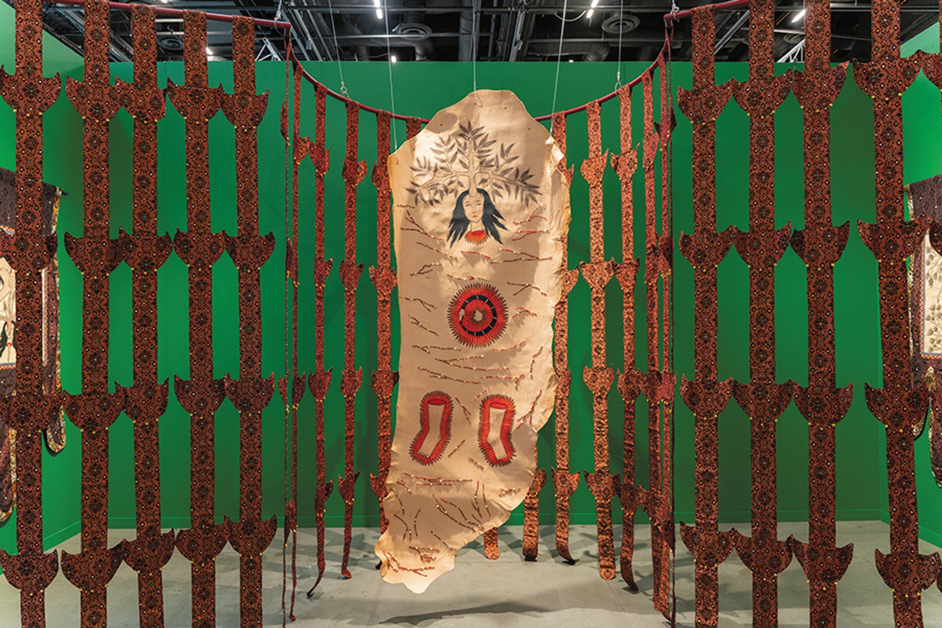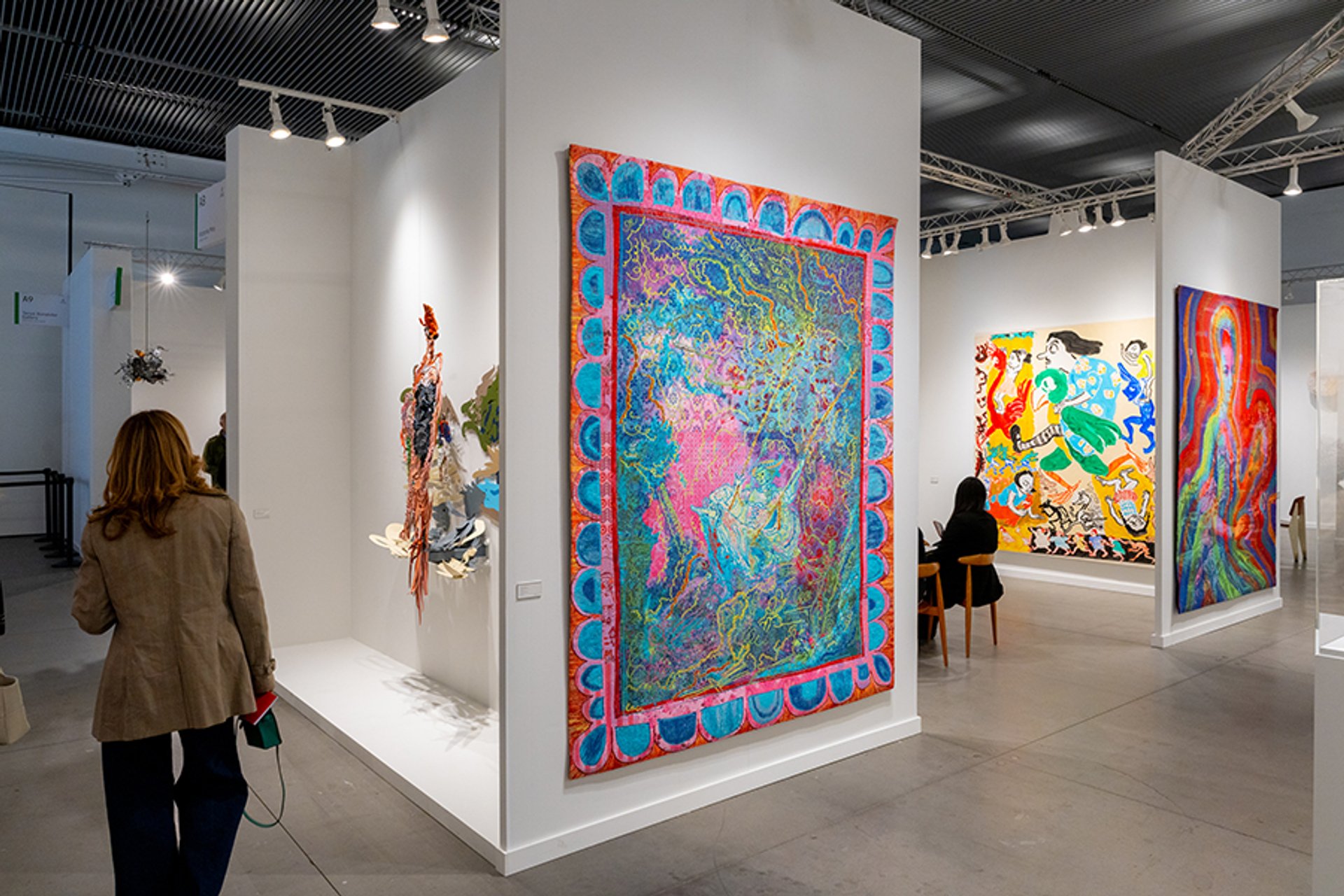 The Singapore-based gallery is showing works by the Balinese artist Citra Sasmita. The smaller works on the stand (priced from $20,000 to $25,000) are made of Kamasan canvas, a material traditionally used to wrap figures in Hindu shrines. Vortex in the Land of Liberation (2025, selling for $38,000) incorporates hand-embellished cowhide, each bead “handsewn by the artist as an art of protest against the increasing industrialisation of these practices”, says a gallery spokesperson.