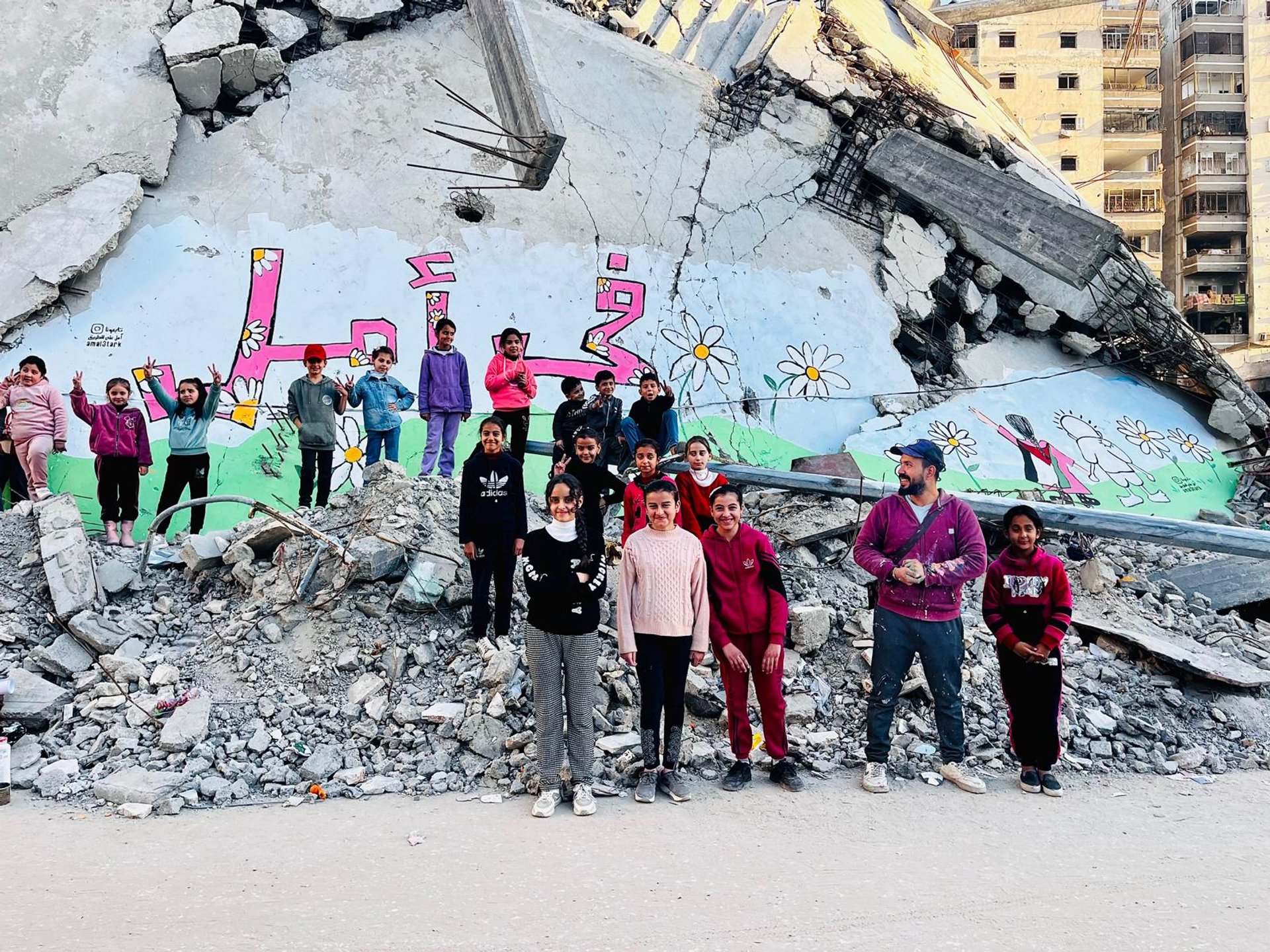 Artist Mustafa Mohanna helps children to express themselves through art, turning rubble into murals as a practical alternative to scarce and costly paper. There is Hope, was painted before the January ceasefire by children in the north, when the area was cut off by Israel and left without humanitarian aid