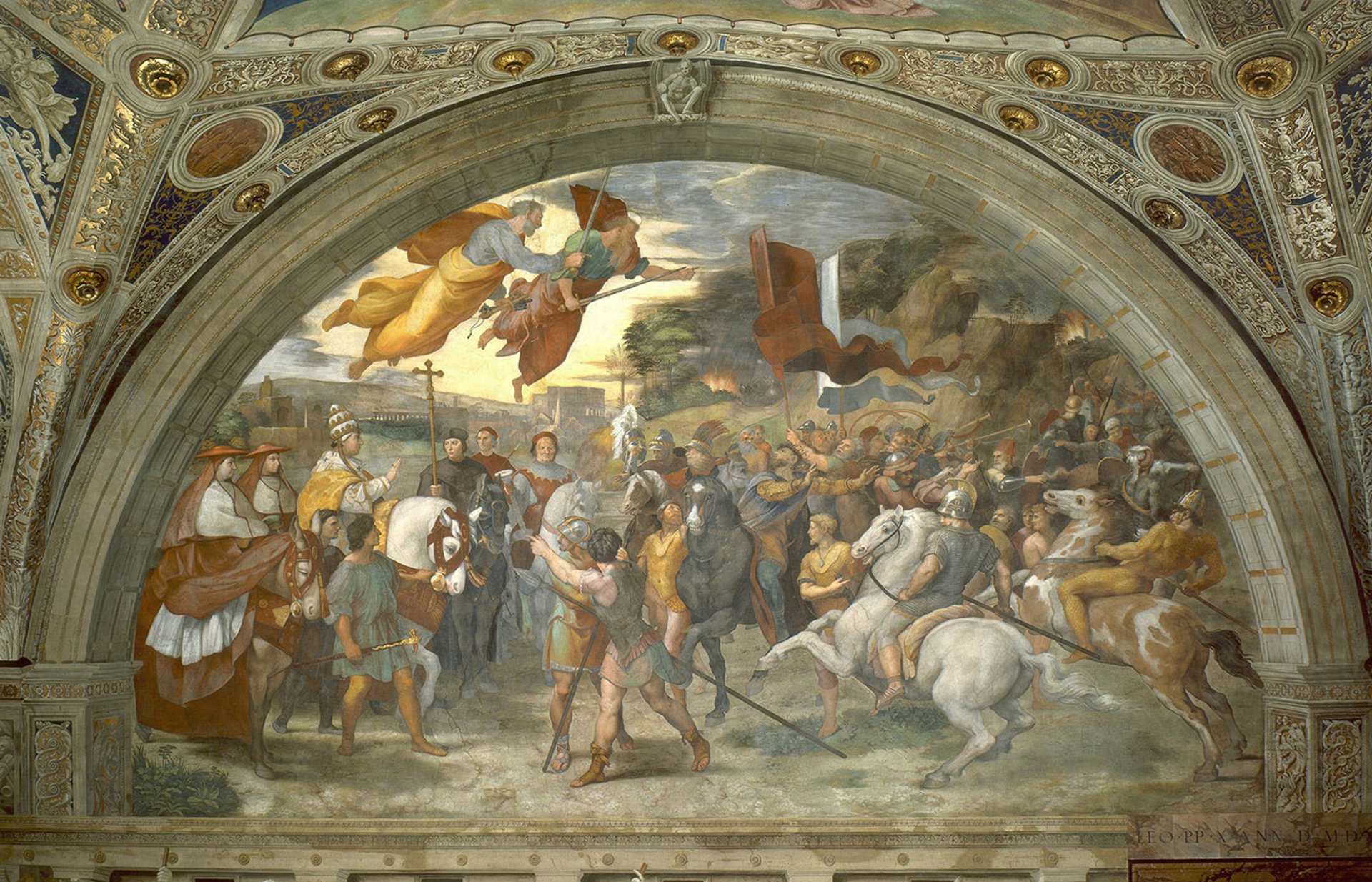 In one of the stanze in the Apostolic Palace is Raphael's The Meeting of Leo the Great and Attila, 1514, depicting the moment in 452 that the first Pope Leo confronted Attila, the feared ruler of the Huns, on the shores of Lake Garda, to persuade him, successfully, not to invade Italy or to proceed to attack Rome. Pope Leo I, in papal crown, mounted on a magnificent white steed, raises his right hand, while a miraculous apparition of Saint Peter and Saint Paul bear swords above him, with Attila looking up at the airborne saints, prostrated and filled with awe.