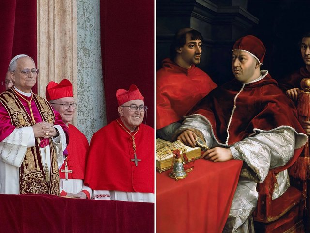 A previous Leo: Raphael's Pope Leo X and cardinals Giulio de' Medici and Luigi de Rossi (1518-20) Uffizi Gallery, Public domain, via Wikimedia Commons