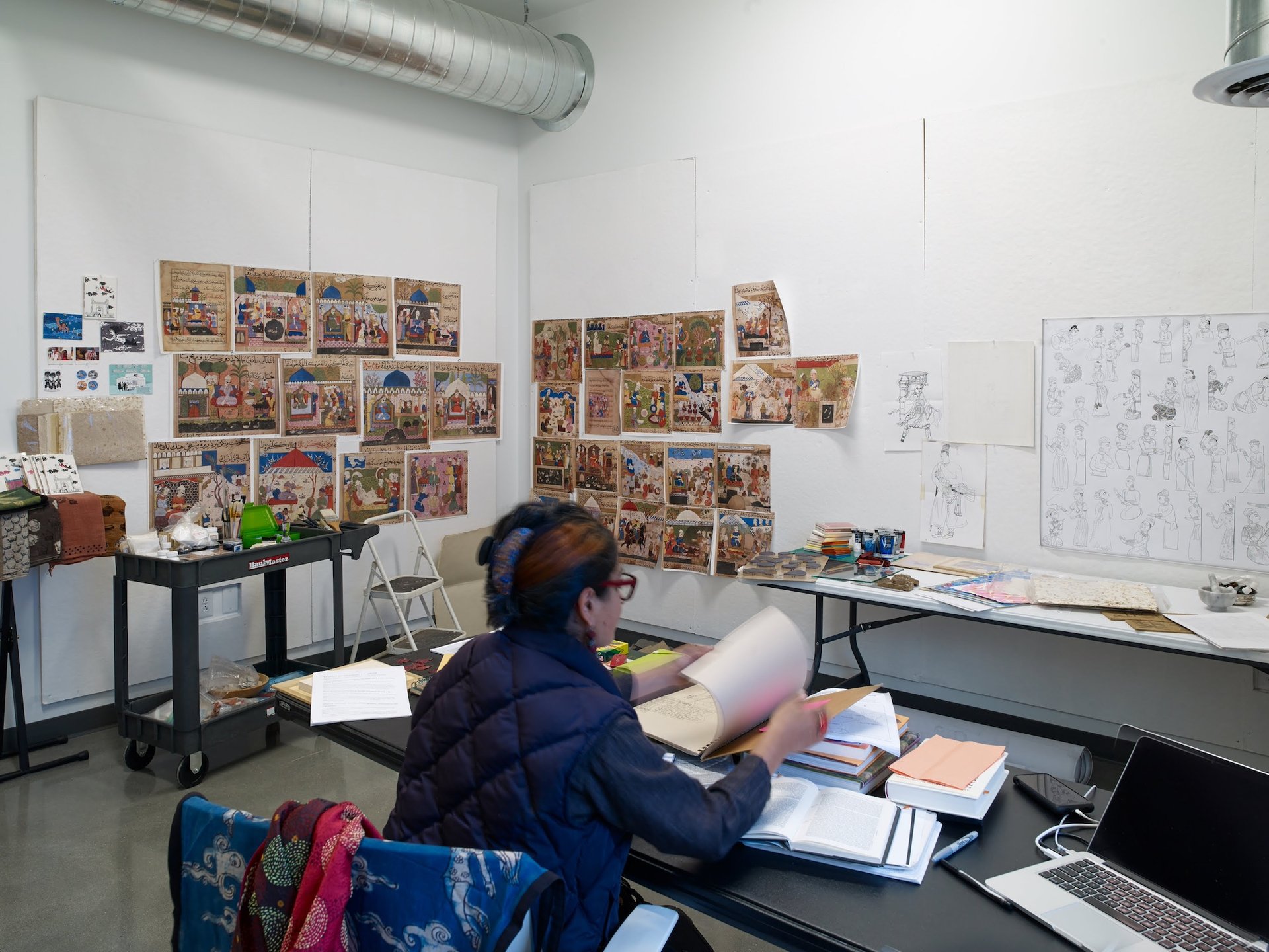 Sarah K. Khan, 2019 Indigo Arts Alliance artist in residence alumnus, working inside one of two dedicated artist studios that are a part of the IAA Studio Building during her residency in 2019 Photo by Darren Setlow