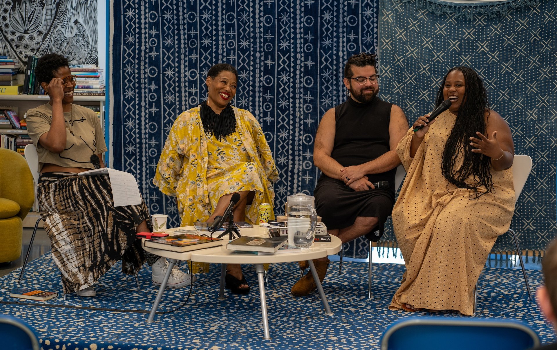 Left to right: Arisa White (2022 Indigo Arts Alliance residency alumnus), Joan Morgan, Matt Garza and Yasmine Jameelah in conversation on the first floor of the IAA Studio Building during an afternoon panel for The Welcome Table, an intergenerational symposium presented in June 2024 by Indigo Arts Alliance to celebrate the cultural and culinary traditions of worldwide historical social justice movements Photo by Mia Del Bene